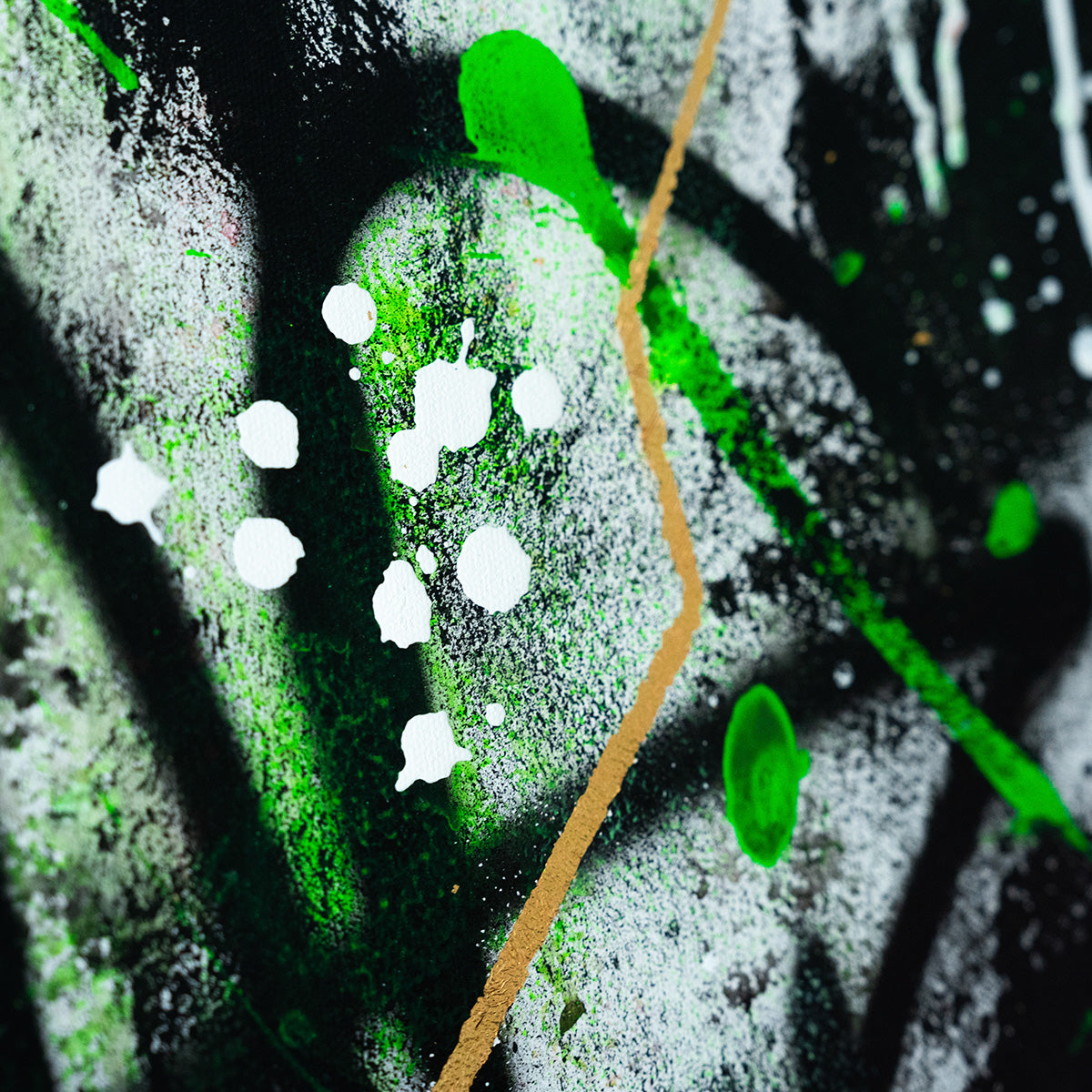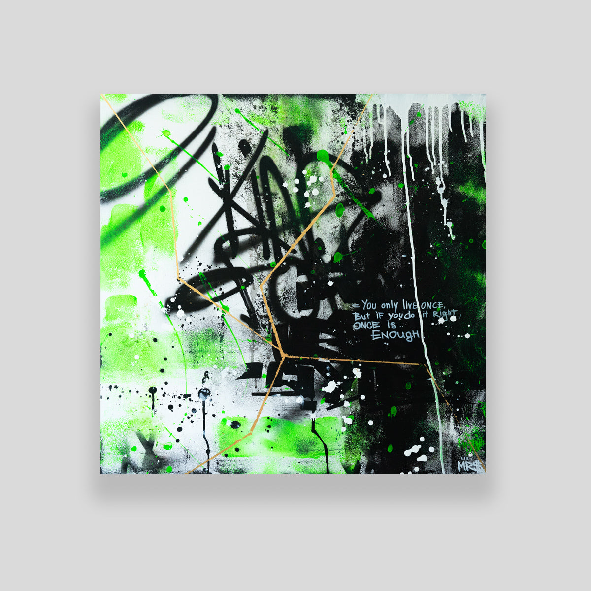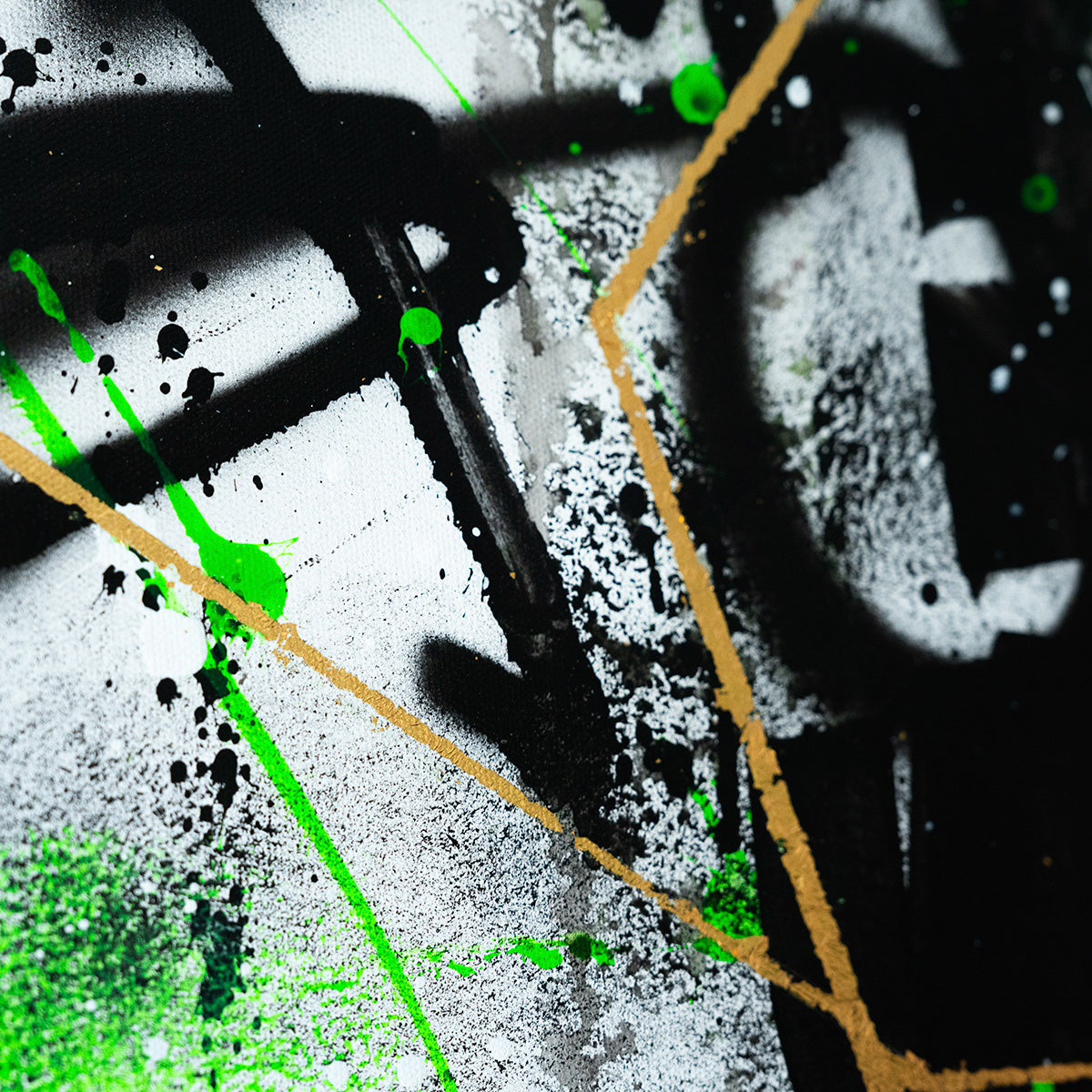This graffiti artwork is a striking blend of black and green tones, creating a bold, urban backdrop. At the center, a golden foil stripe runs through, symbolizing the path of success and ambition amidst the chaos. The vibrant gold contrasts beautifully with the darker shades, drawing attention to a motivating message written across the stripe. Golden Path of Ambition serves as both an aesthetic and a philosophical statement, urging viewers to stay focused and chase their dreams, no matter the obstacles.