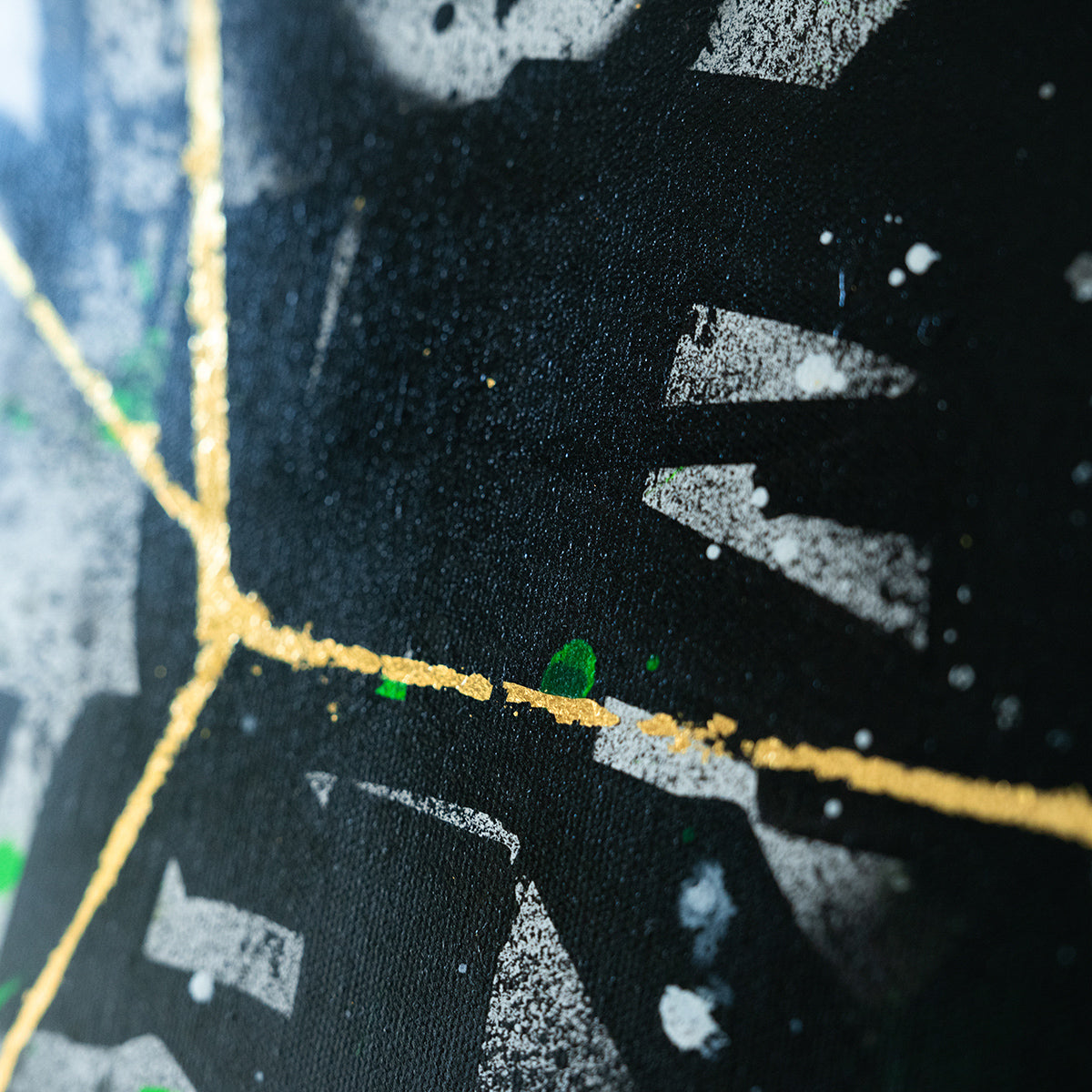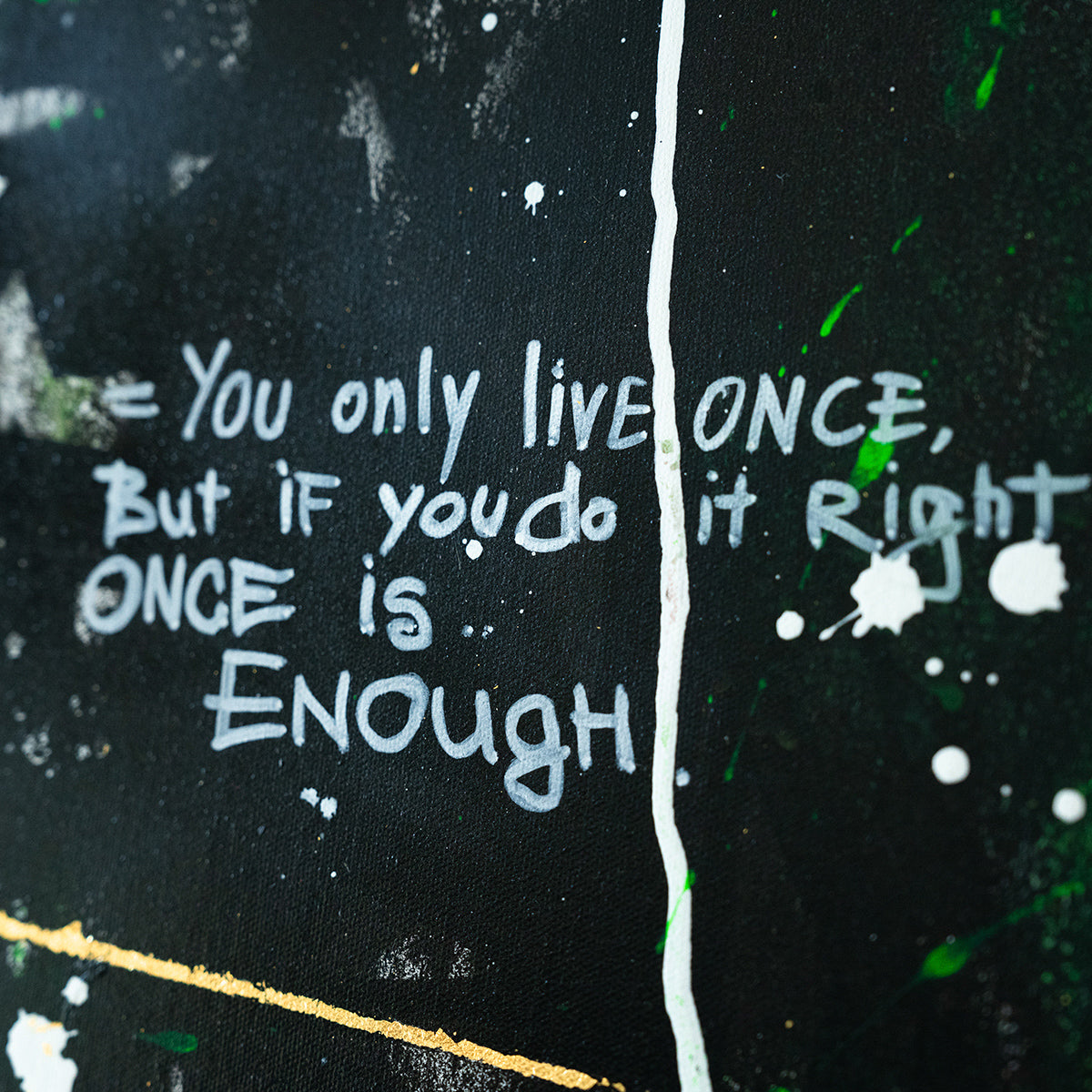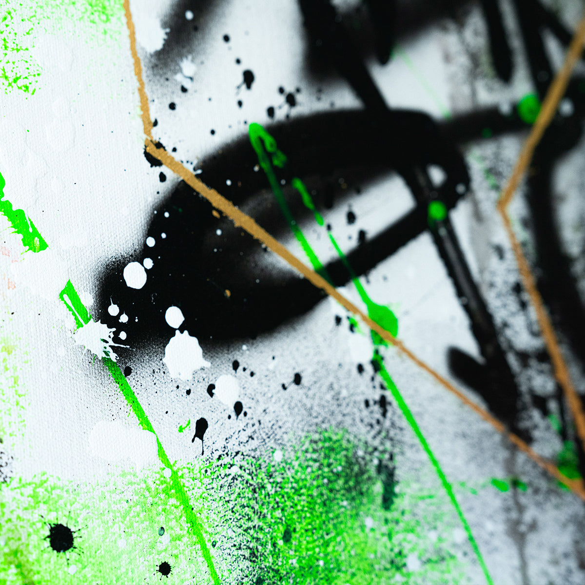 This graffiti artwork is a striking blend of black and green tones, creating a bold, urban backdrop. At the center, a golden foil stripe runs through, symbolizing the path of success and ambition amidst the chaos. The vibrant gold contrasts beautifully with the darker shades, drawing attention to a motivating message written across the stripe. Golden Path of Ambition serves as both an aesthetic and a philosophical statement, urging viewers to stay focused and chase their dreams, no matter the obstacles.