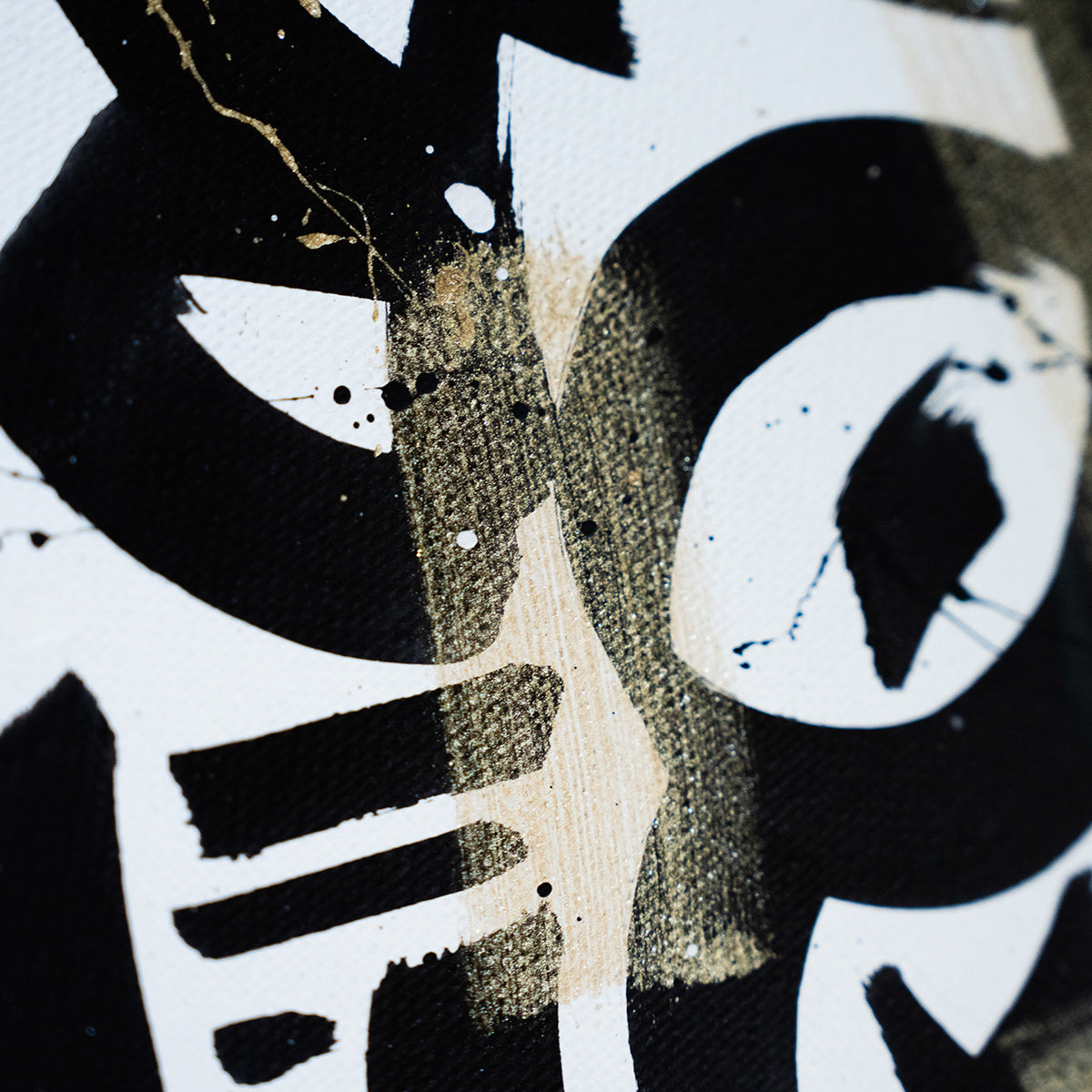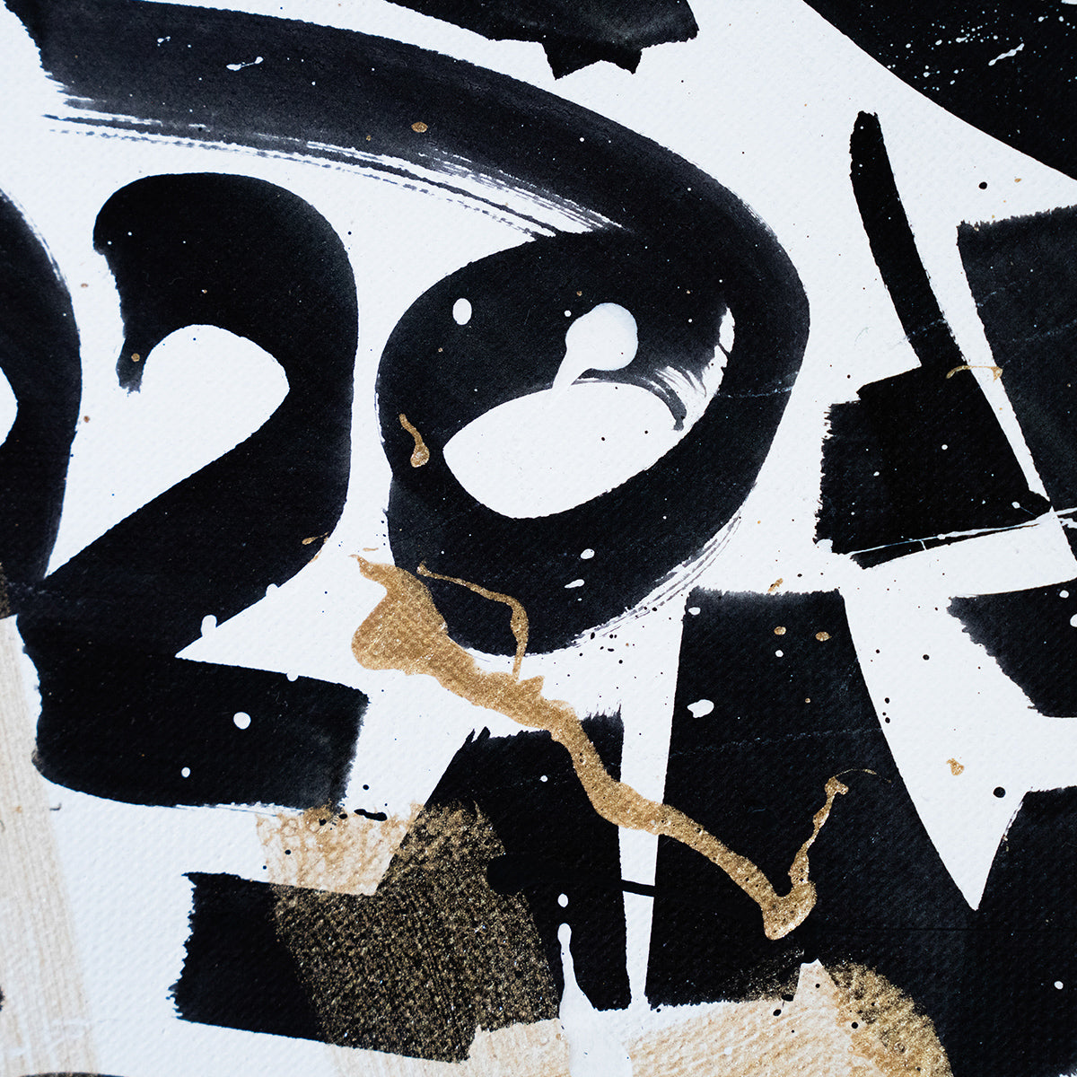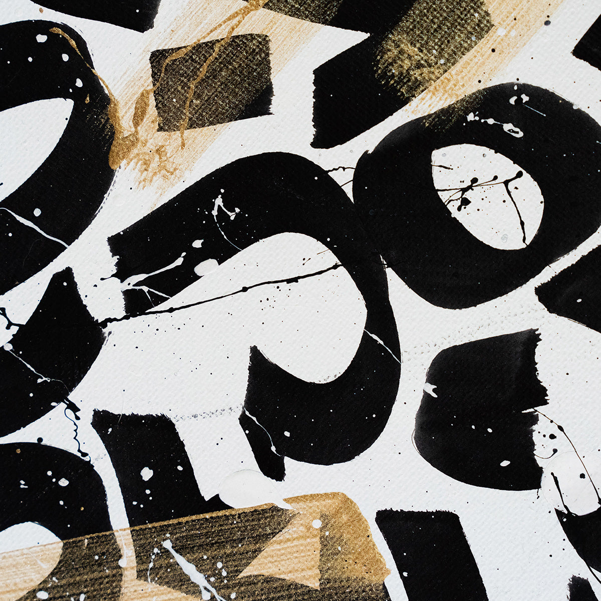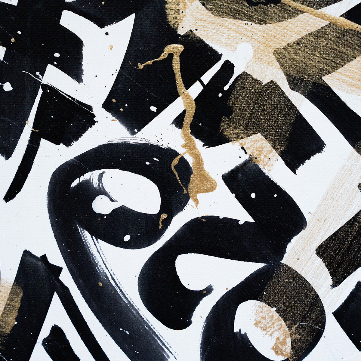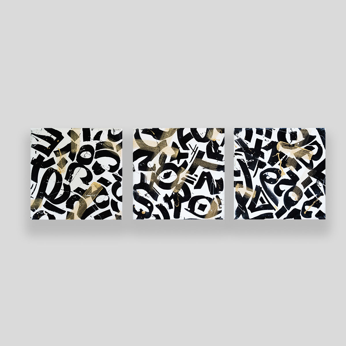 This artwork consists of three identical panels, each showcasing a striking Gothic design. The panels are set against a clean white background, with bold black Gothic typography dominating the composition. The intricate lettering is beautifully contrasted by the delicate use of golden splashes, adding a touch of elegance and depth. The uniformity of the panels creates a cohesive and visually captivating experience, drawing attention to the powerful contrast between the black text and the golden accents. Triptych of Gothic Expression blends dark, dramatic elements with a refined sense of artistry, inviting the viewer into a world of mystery and beauty.