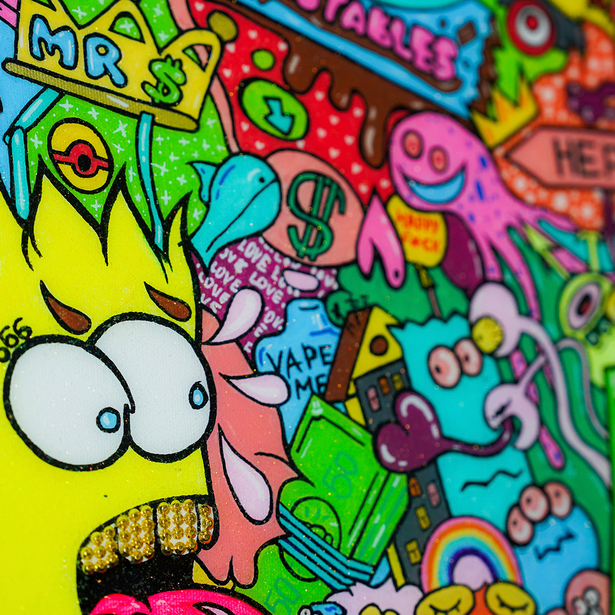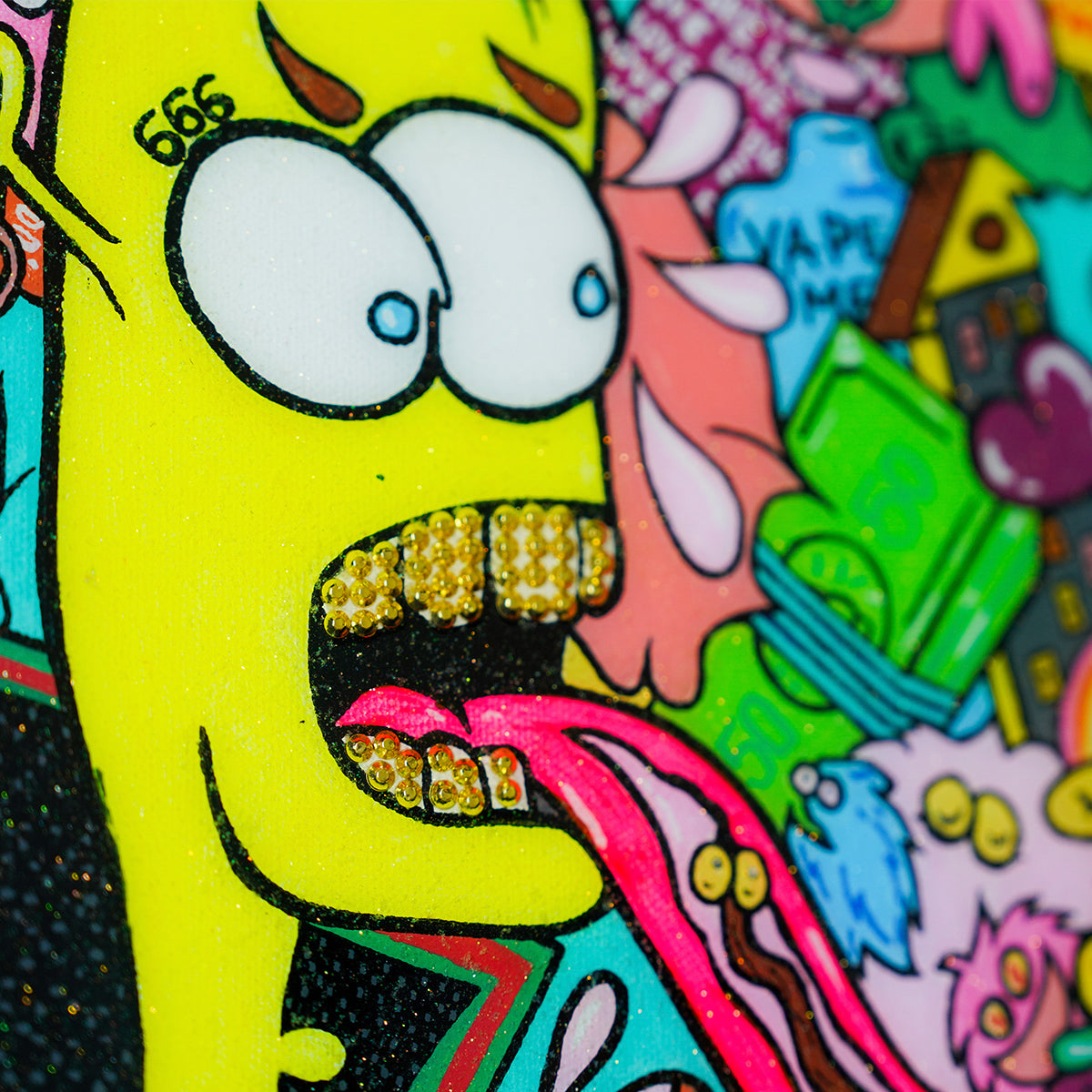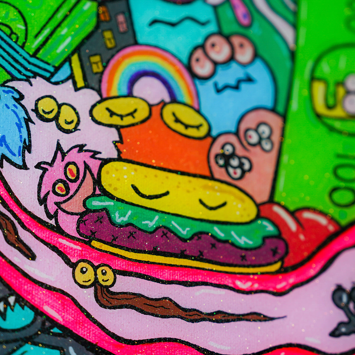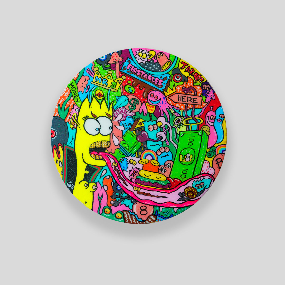 This round pop-art painting depicts a mysterious creature with its mouth wide open, trying to capture money. As its tongue extends, it also catches an unsettling mix of useless trash and bacteria, symbolizing how the pursuit of material wealth often comes with undesirable consequences.
