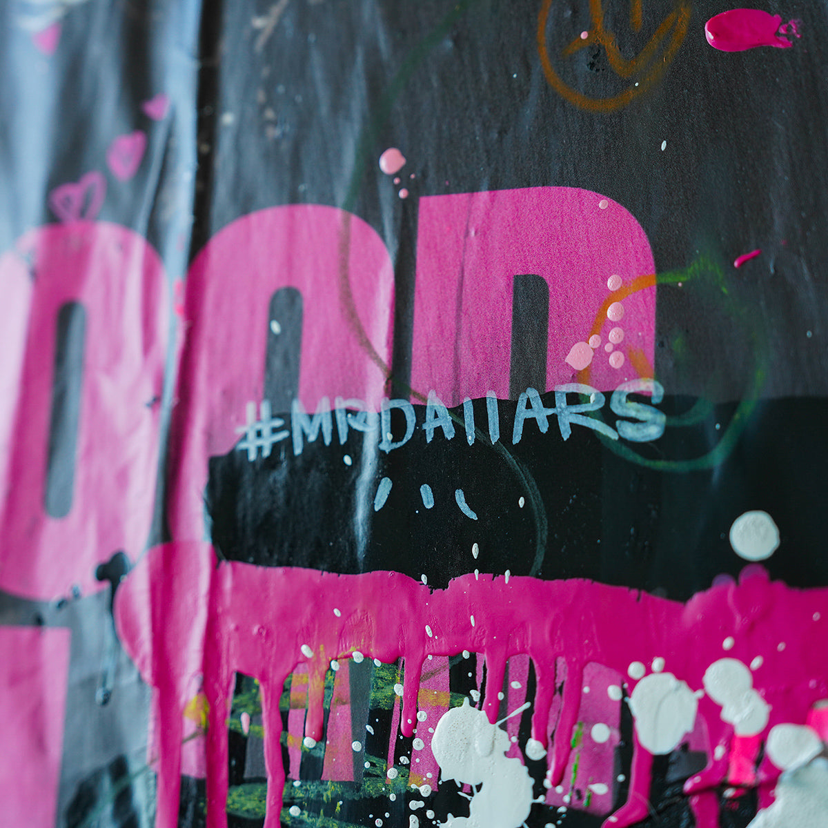 The contrast between the raw street elements and sleek pop art style creates a striking visual experience, symbolizing the intersection of music, fame, and everyday life.