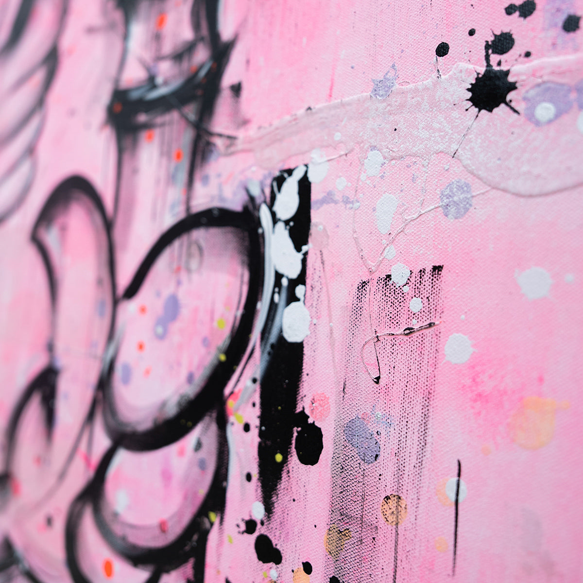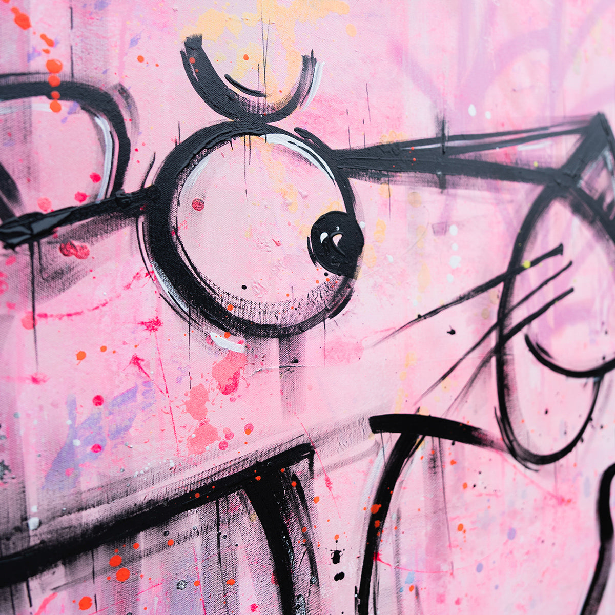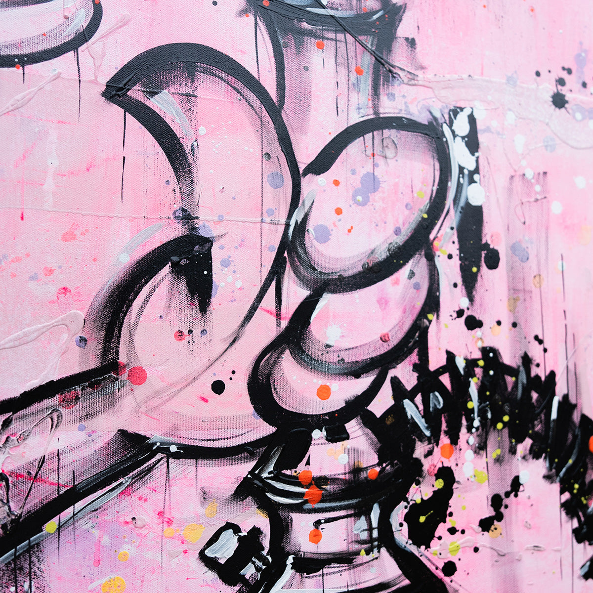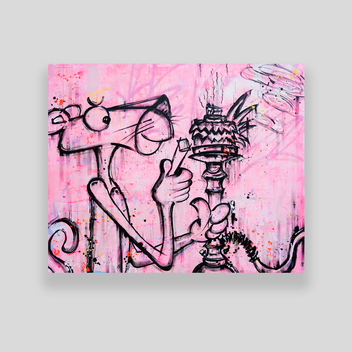 This vibrant pop-art piece showcases the Pink Panther in a playful moment, preparing a hookah. The artwork is dominated by soft pink and white hues, enhanced with subtle black spray paint splatters for a bold, urban feel. The main outline of the character is drawn in striking black, adding depth and definition to the scene. The fusion of nostalgic cartoon imagery with modern street-art elements creates a dynamic and eye-catching composition