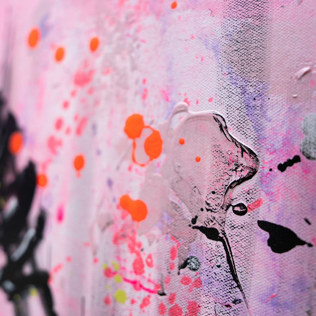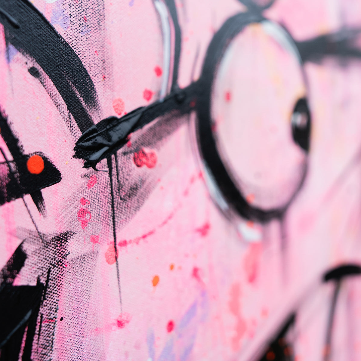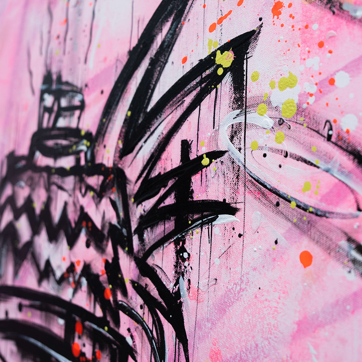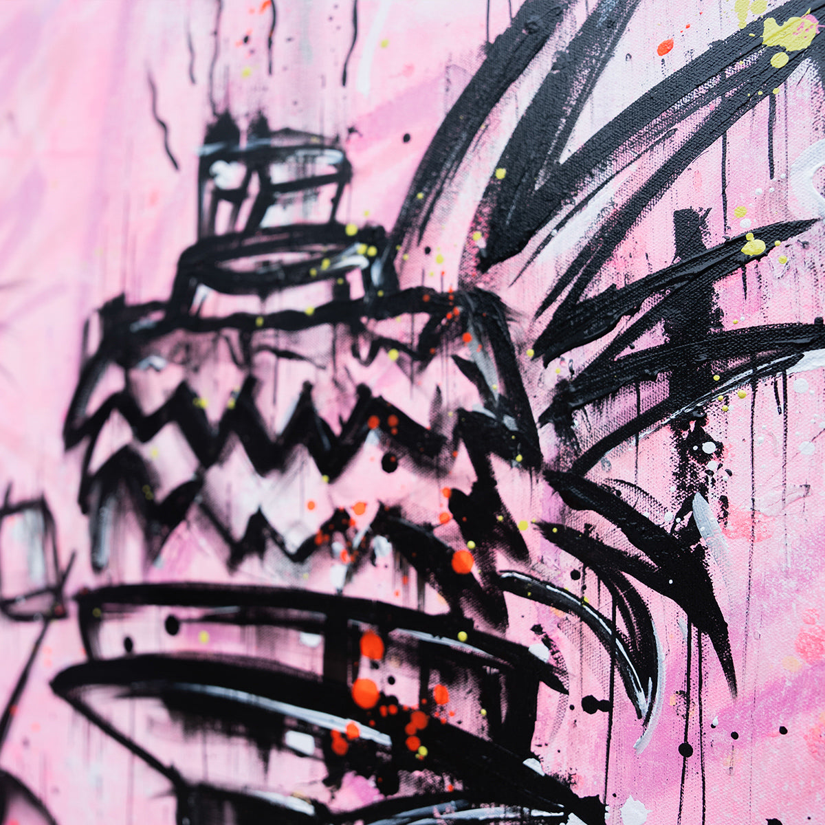 This vibrant pop-art piece showcases the Pink Panther in a playful moment, preparing a hookah. The artwork is dominated by soft pink and white hues, enhanced with subtle black spray paint splatters for a bold, urban feel. The main outline of the character is drawn in striking black, adding depth and definition to the scene. The fusion of nostalgic cartoon imagery with modern street-art elements creates a dynamic and eye-catching composition