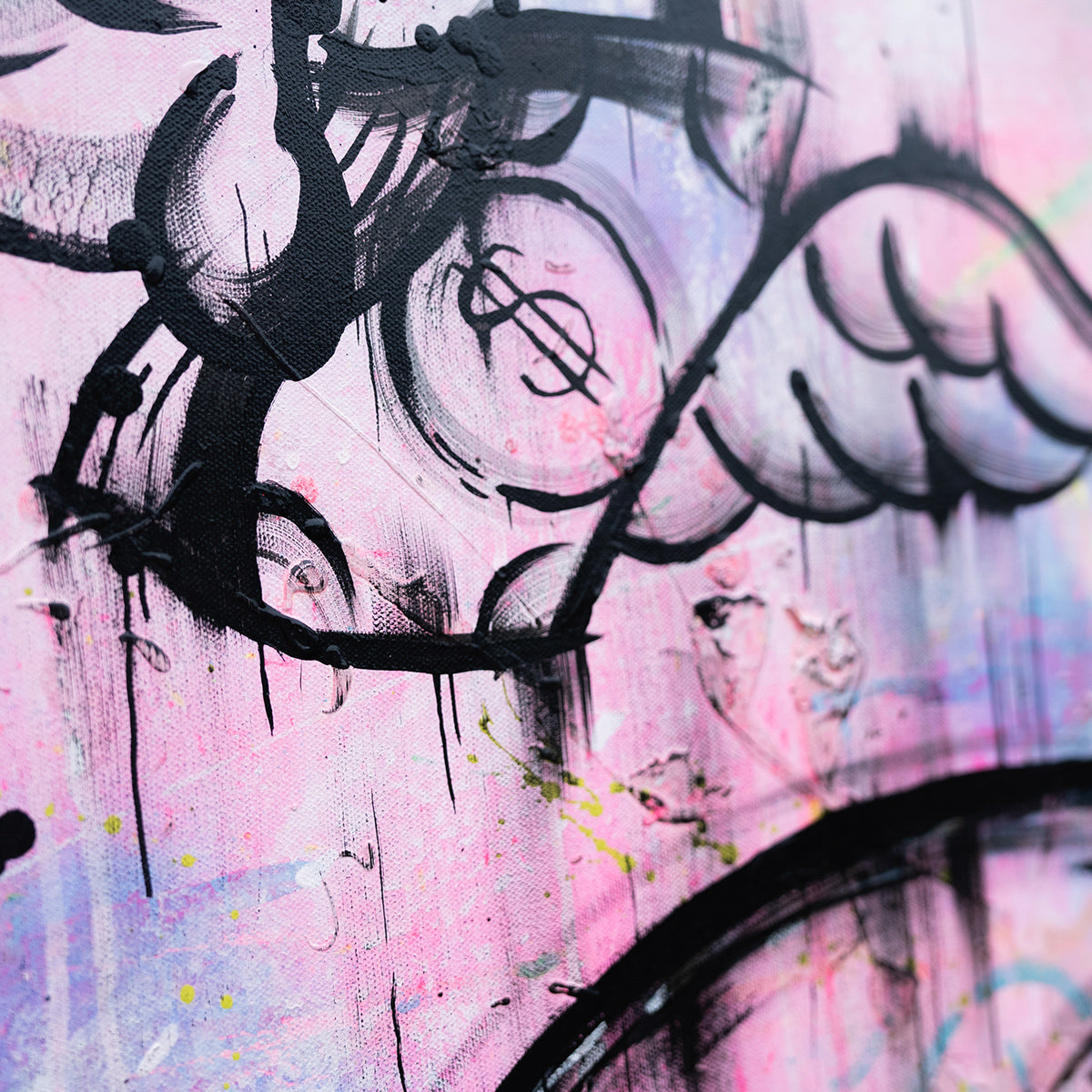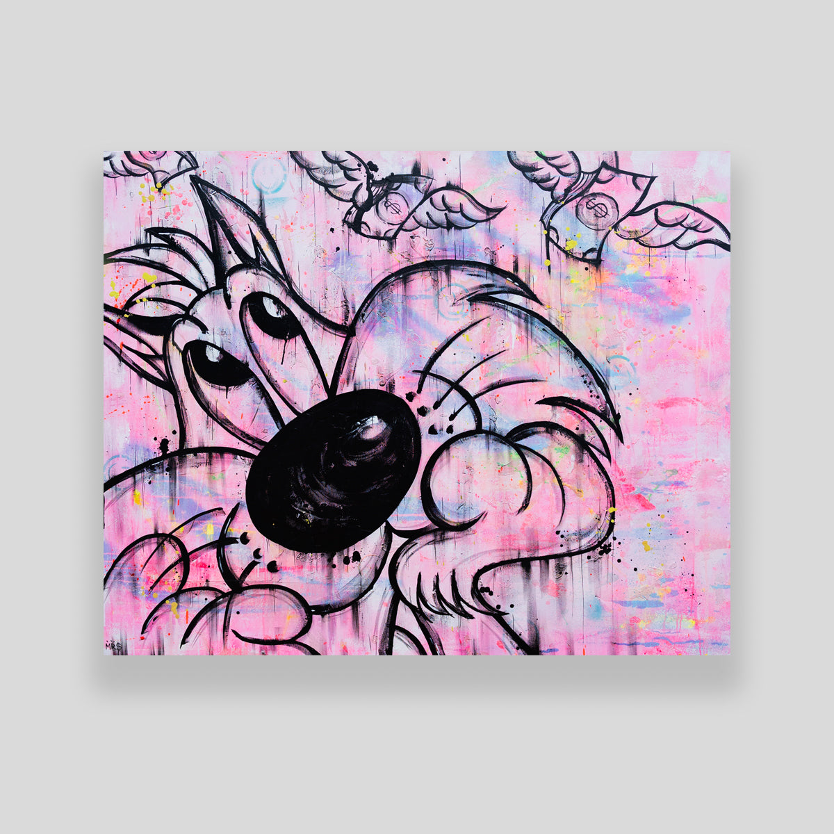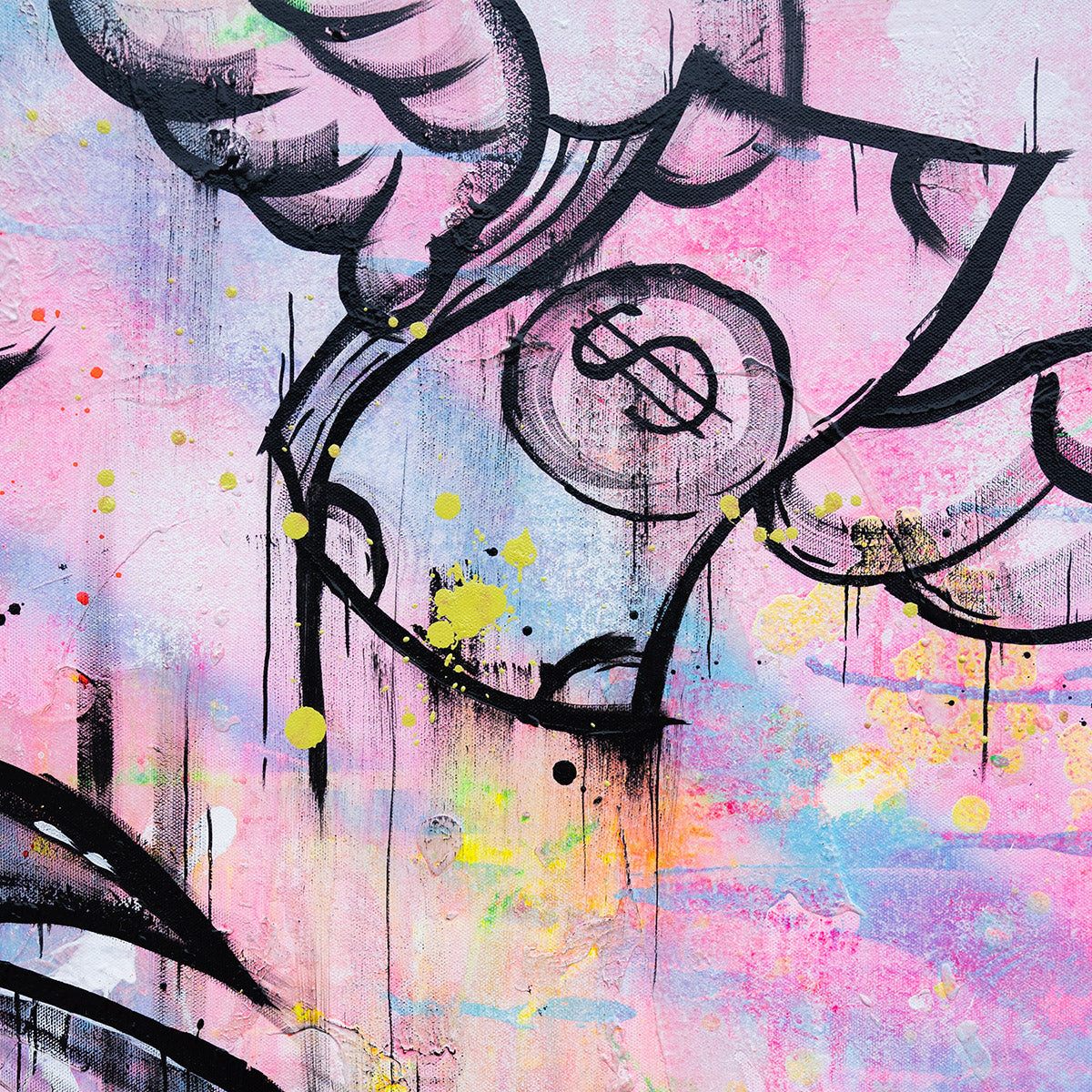 This playful artwork captures a cat delighting in the sight of flying money, with bills sprouting delicate wings as they soar around. The scene is bathed in soft pink hues, creating a dreamy and whimsical atmosphere. The cat itself is outlined in bold black, making it stand out against the gentle pastel background. This piece blends charm and fantasy, symbolizing luck, prosperity, and the joy of unexpected fortune.