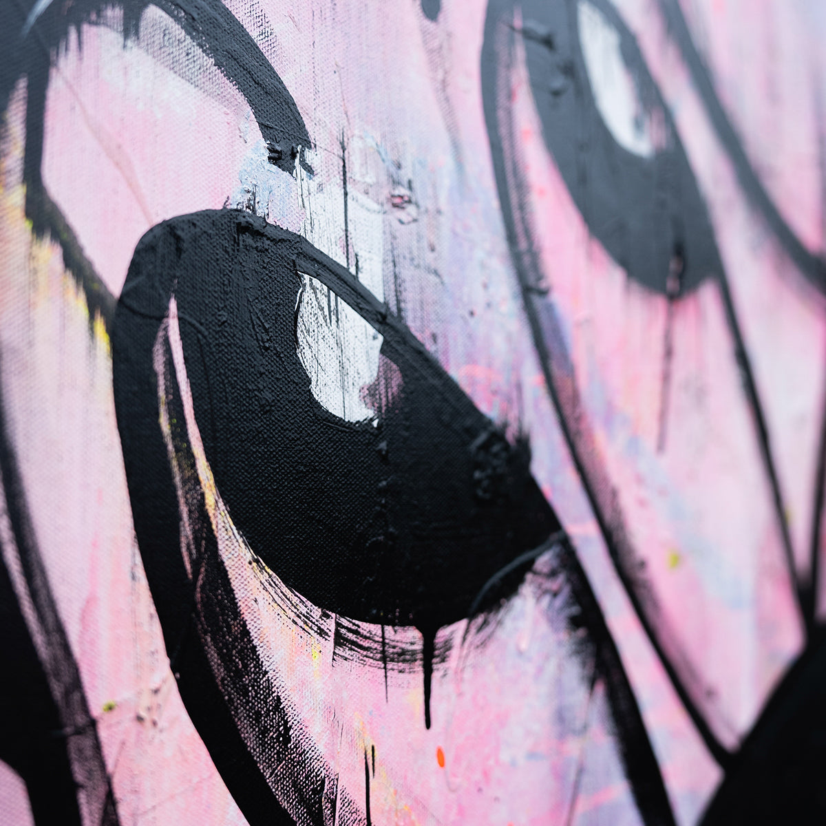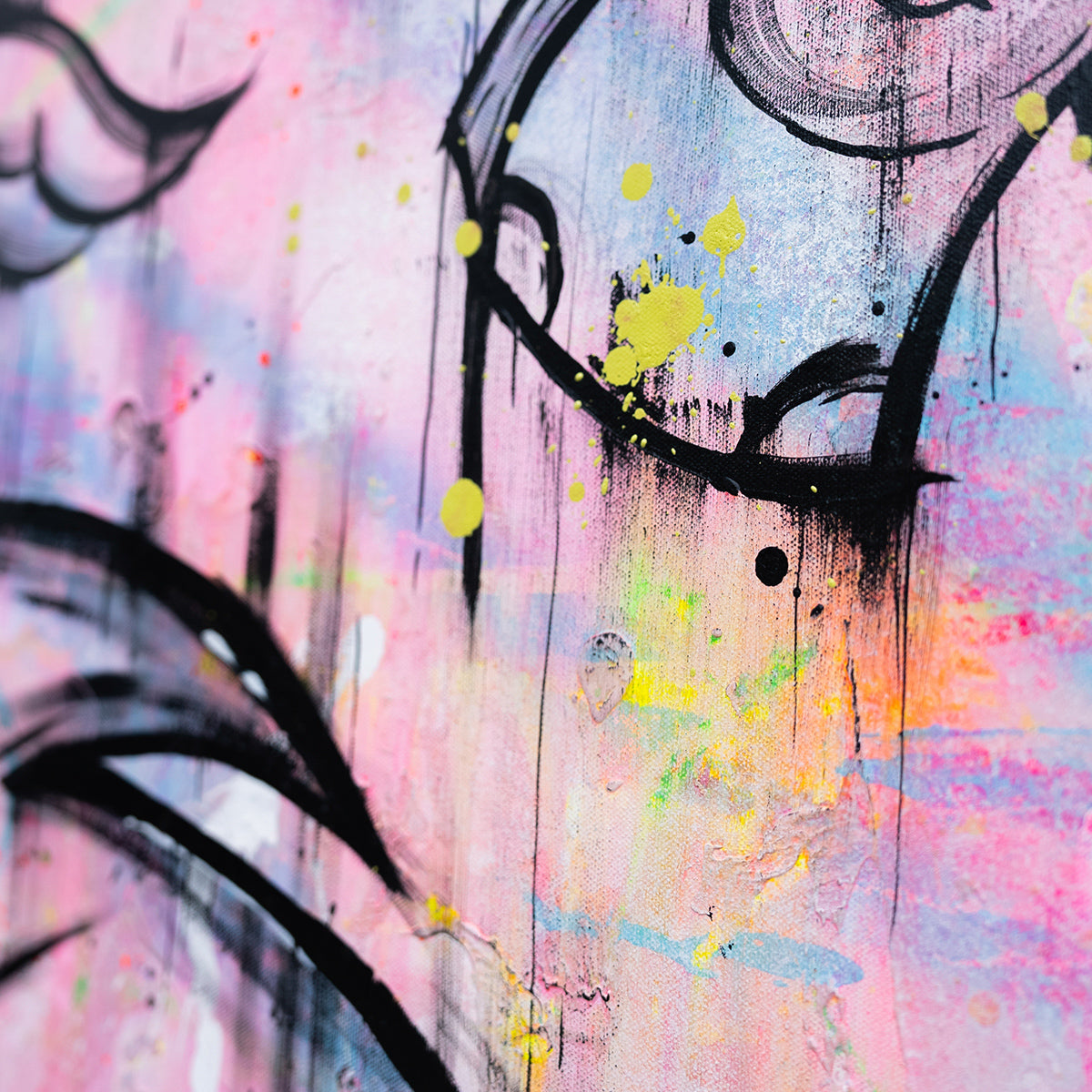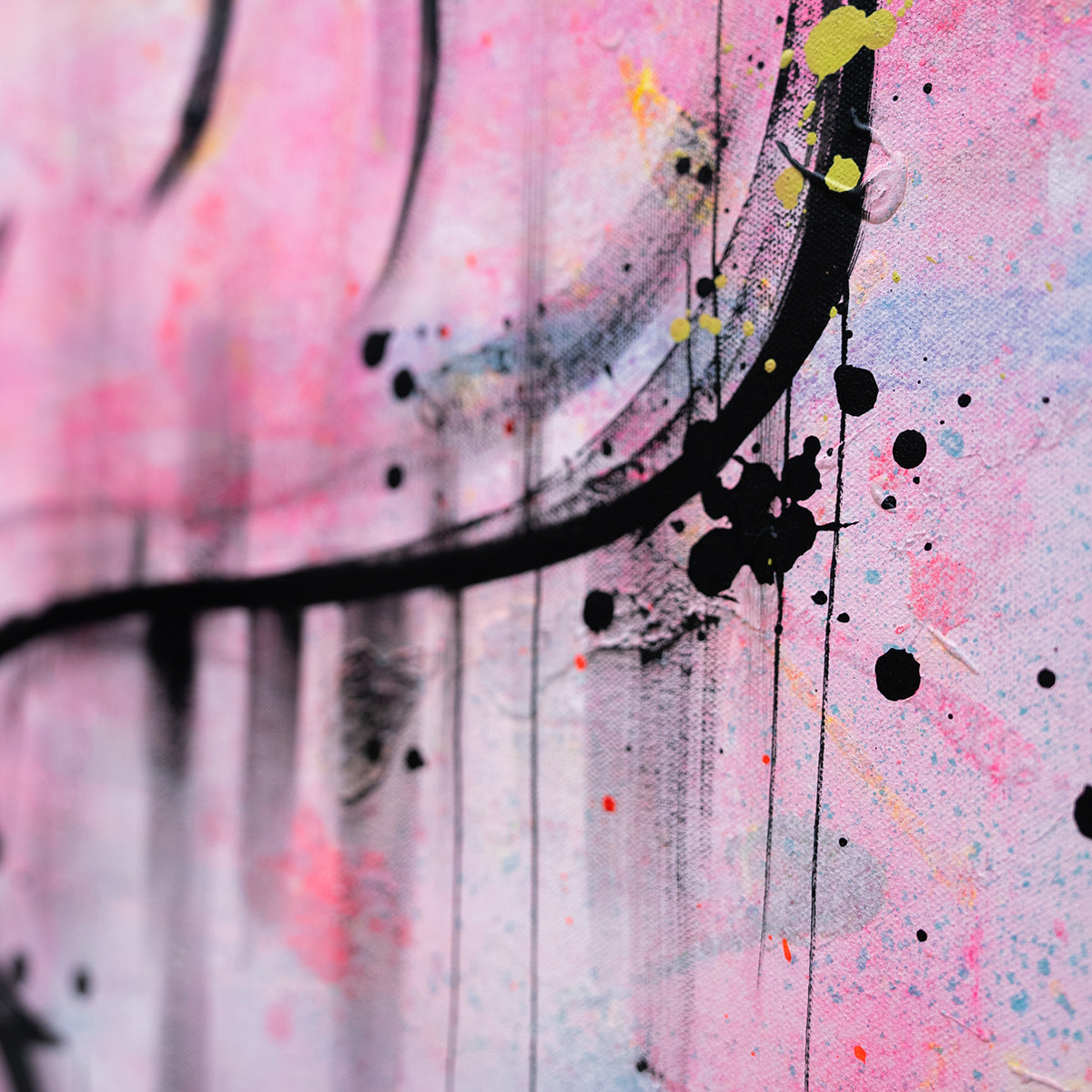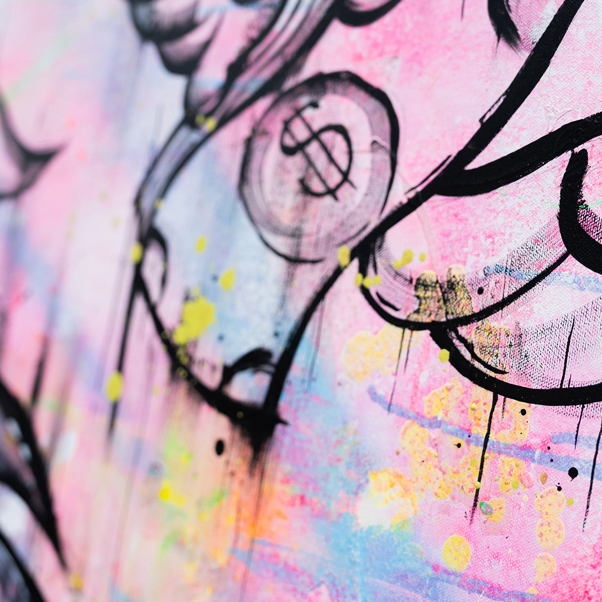 This playful artwork captures a cat delighting in the sight of flying money, with bills sprouting delicate wings as they soar around. The scene is bathed in soft pink hues, creating a dreamy and whimsical atmosphere. The cat itself is outlined in bold black, making it stand out against the gentle pastel background. This piece blends charm and fantasy, symbolizing luck, prosperity, and the joy of unexpected fortune.