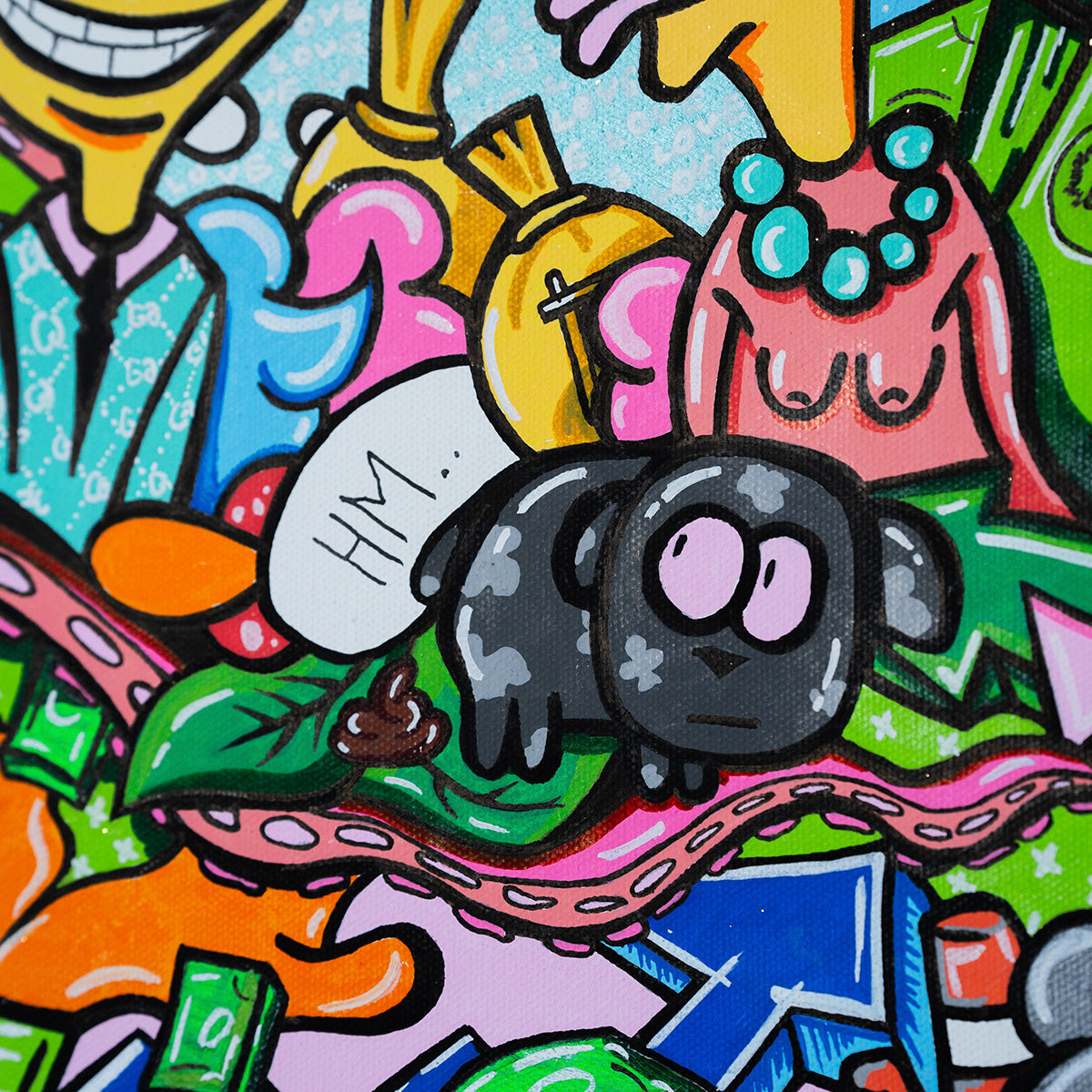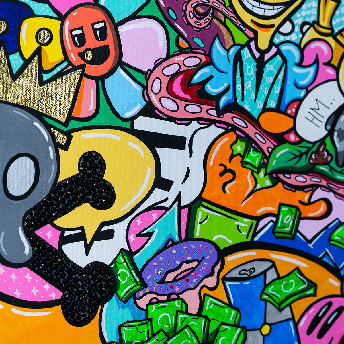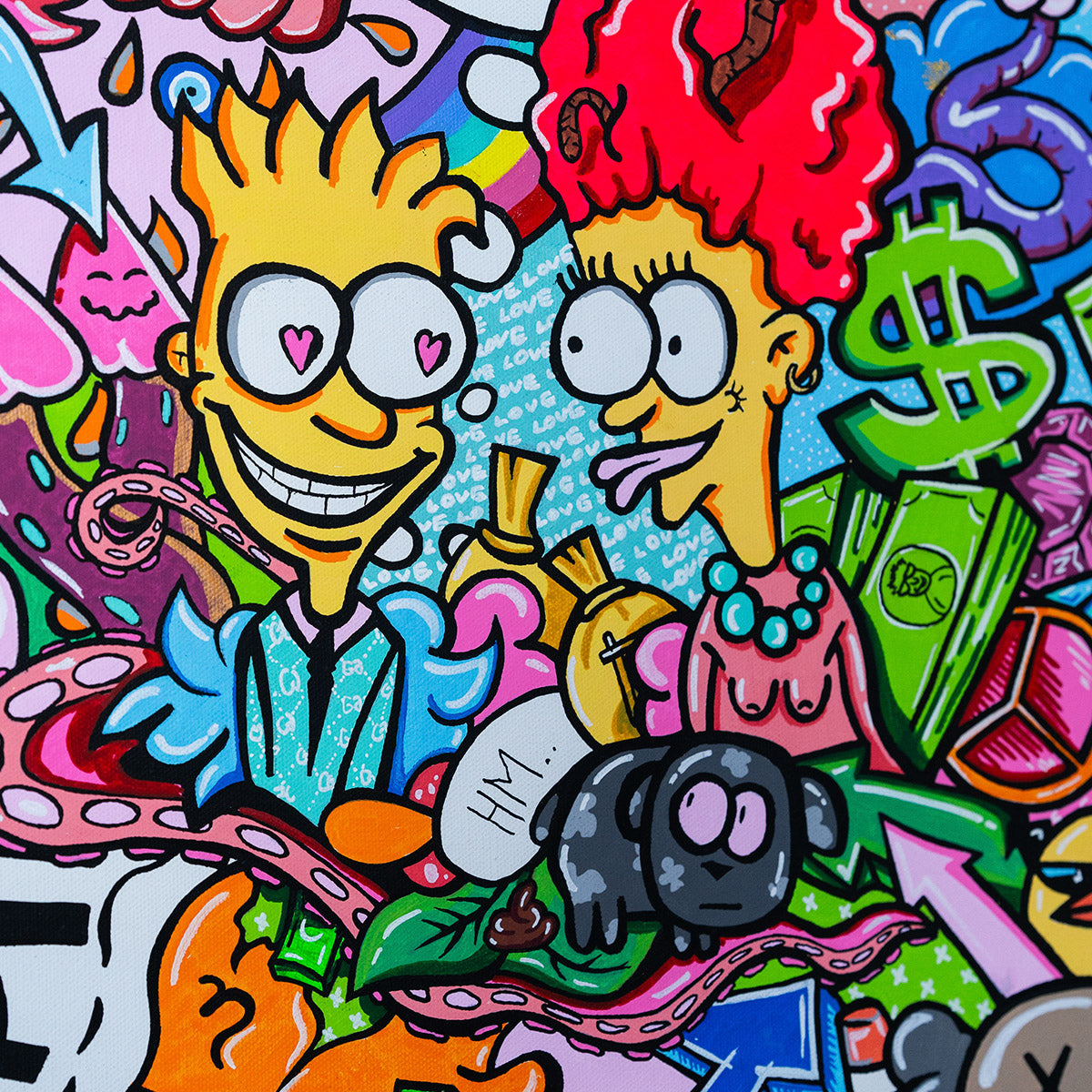 This provocative piece of art depicts a young man deeply infatuated with an older woman, drawn not by her age but by her drive and dedication to her work. His love transcends conventional boundaries, seeing only her ambition and strength. Meanwhile, a dog watches the scene with a humorous reaction, overwhelmed by the situation, even to the point of defecating. Surrounding them is an abundance of money, emphasizing the materialistic world in which their connection is set. Love Beyond Limits challenges societal norms, exploring themes of love, ambition, and the absurdity of a world ruled by wealth.