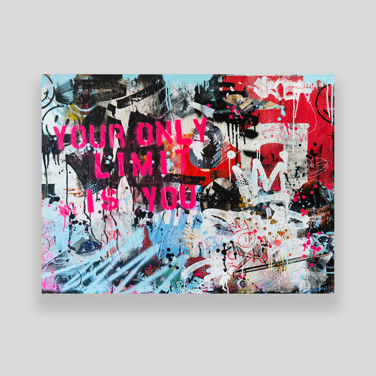 This street art piece blends elements of pop art with raw urban energy, using billboards sourced from various walls throughout the city. The central focus is a skateboarder mid-air, capturing the thrill of movement and freedom. Above him, the bold phrase Only Limit is You serves as an empowering message, urging the viewer to break past their own boundaries. The combination of the vibrant, dynamic style of pop art with the gritty, real-world feel of street art creates a powerful visual statement about self-limitation and the pursuit of greatness.