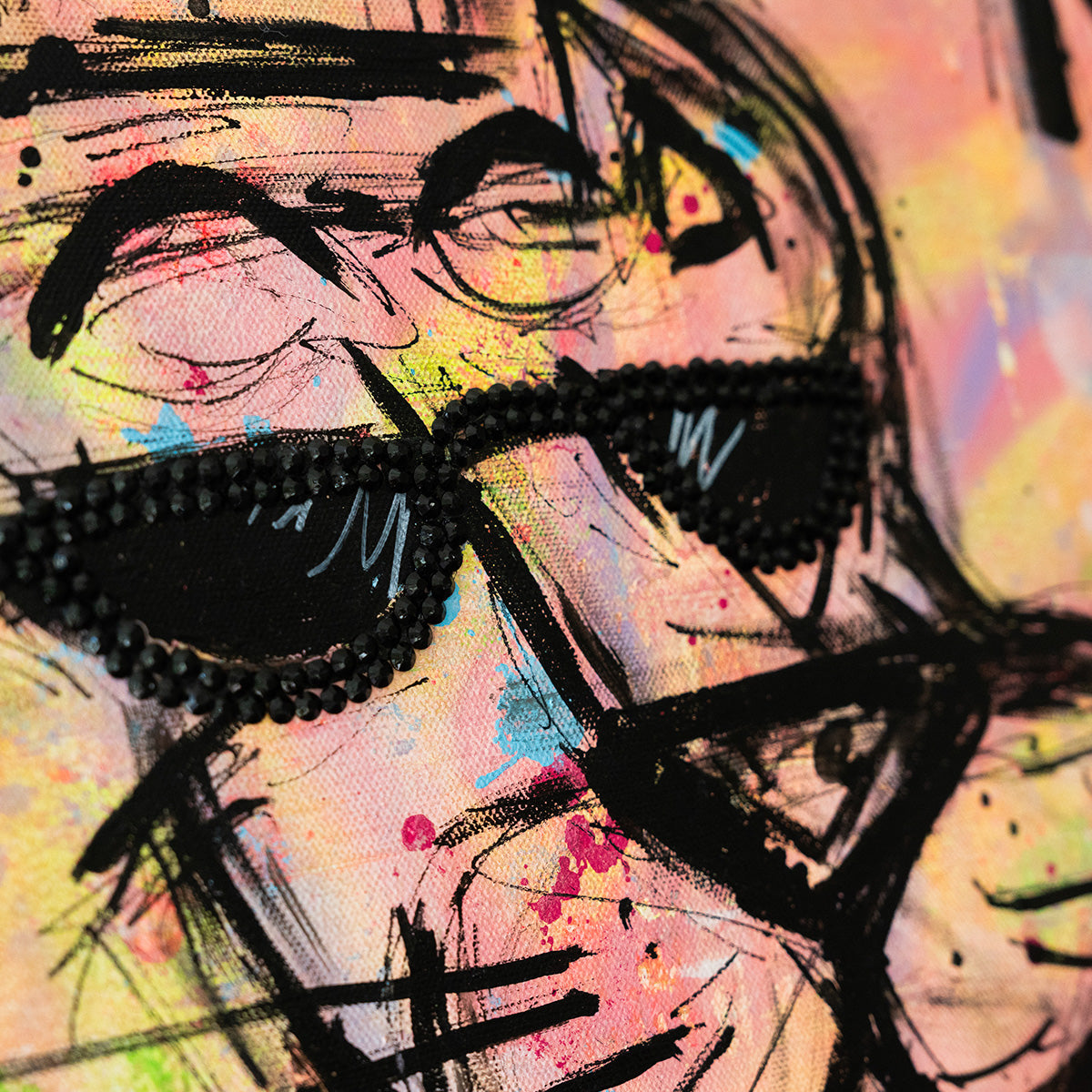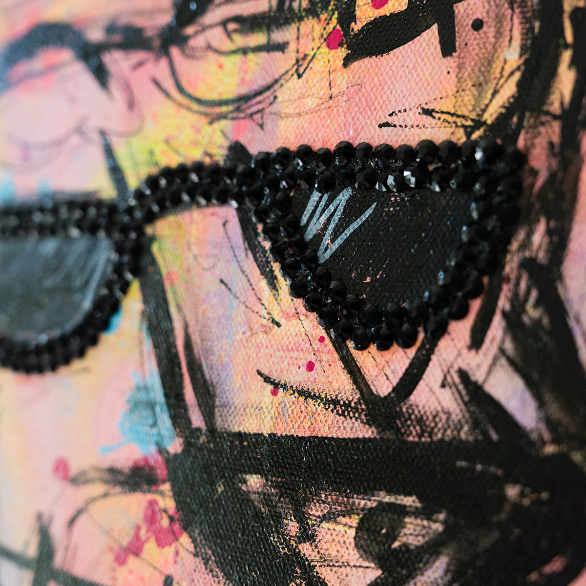 This playful artwork features the iconic Pink Panther lounging on a pile of money bags and bitcoins, embodying a sense of carefree wealth. She wears sparkling rhinestone sunglasses, adding a touch of glamour to her relaxed pose, while a dollar sign ornament hangs from her chest as a statement of luxury. The phrase No More Stress is written in bold letters, contrasting with the lavish scene, as if to say that she has found the ultimate escape from worry and hardship. Pink Panther's Rich Relaxation is a fun and humorous take on the pursuit of wealth and the comfort it can bring.
