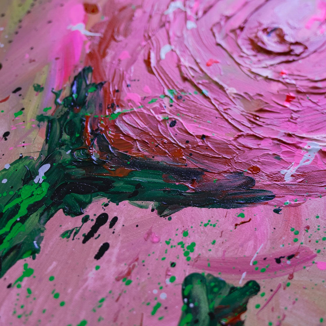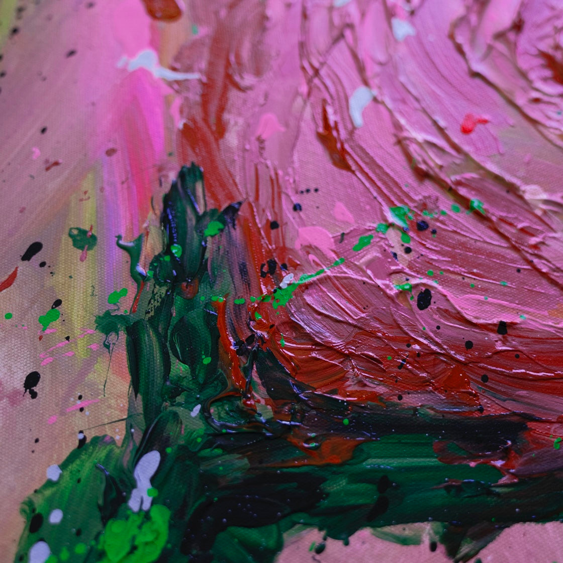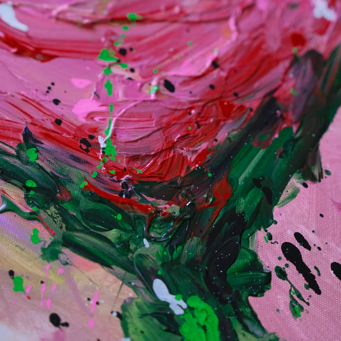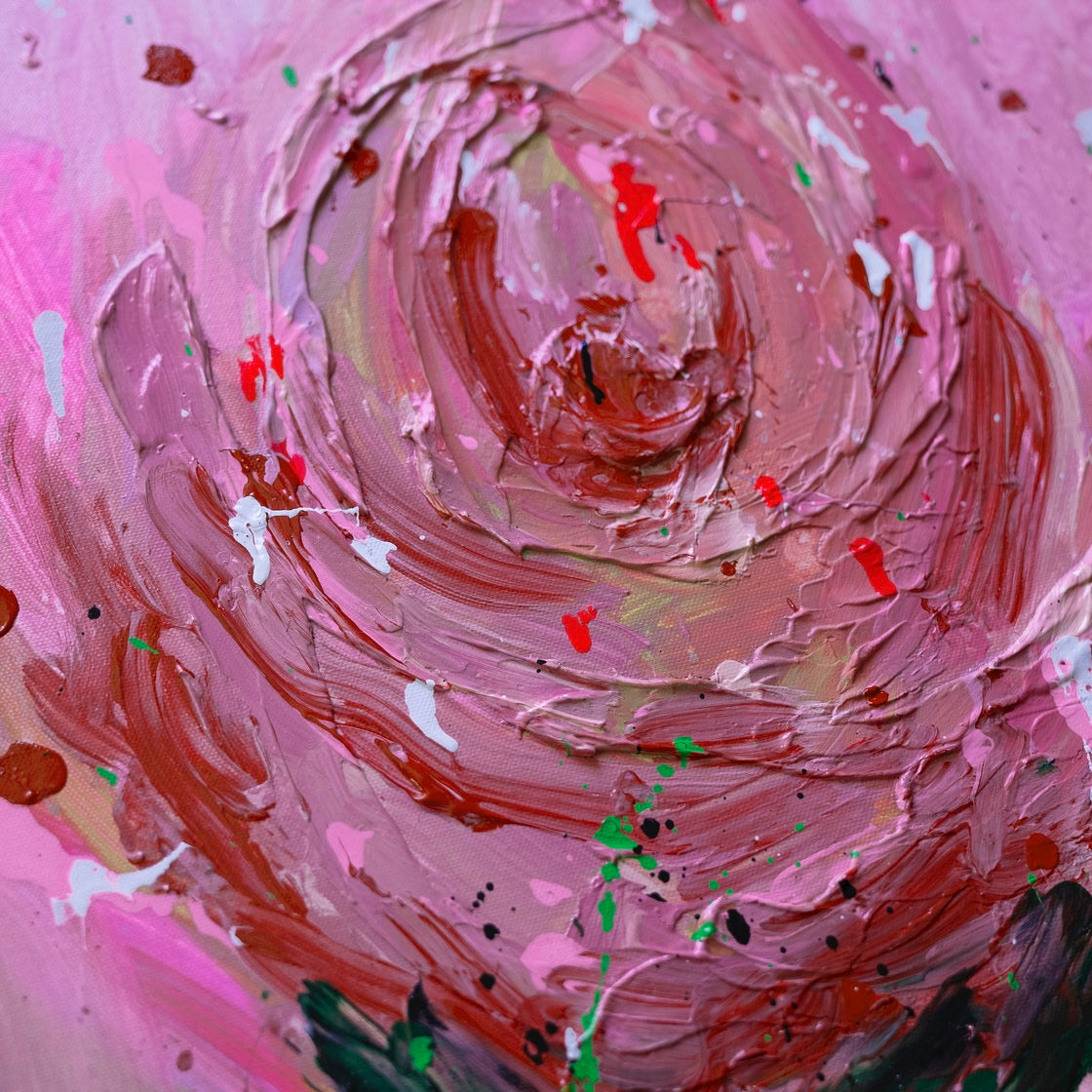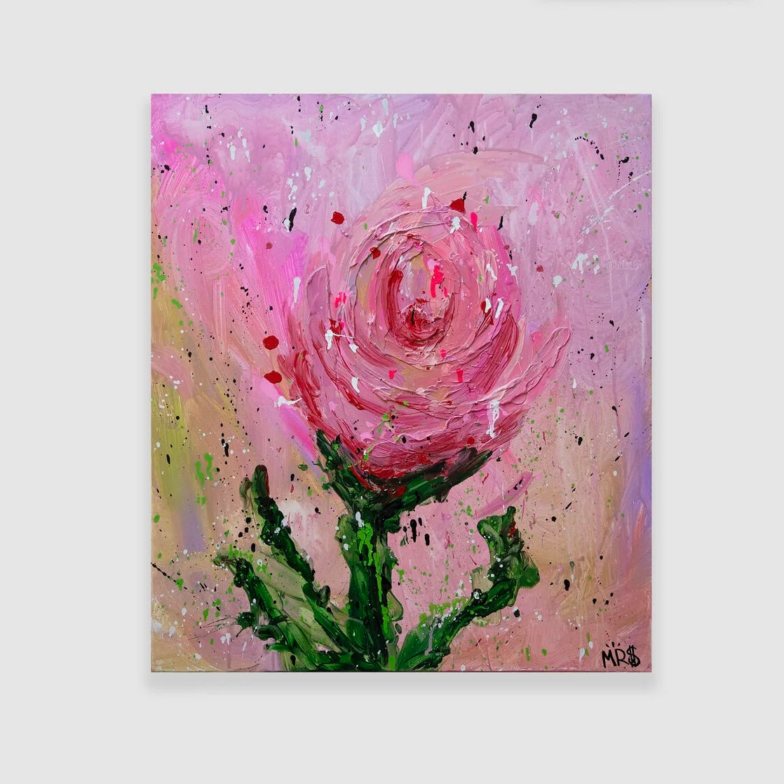 "Bloom in Reverie" is an impressionistic celebration of a single rose, a delicate moment captured in thick, passionate brushstrokes. Washes of pink and touches of white swirl together to form the petals, each stroke adding to the depth and vitality of the bloom. Speckles of green and flecks of darker hues suggest a dance of light and shadow, lending the piece an air of dreamy romanticism. This painting embodies the beauty of growth and the transient, yet enduring quality of nature's artistry. It's a canvas that invites the onlooker to pause and reflect on the simplicity and complexity of a single flower—a symbol of love, life, and the fleeting nature of both. Perfect for adding a dash of natural elegance to any space, this artwork whispers a soft sonnet of the perennial spring of the soul.