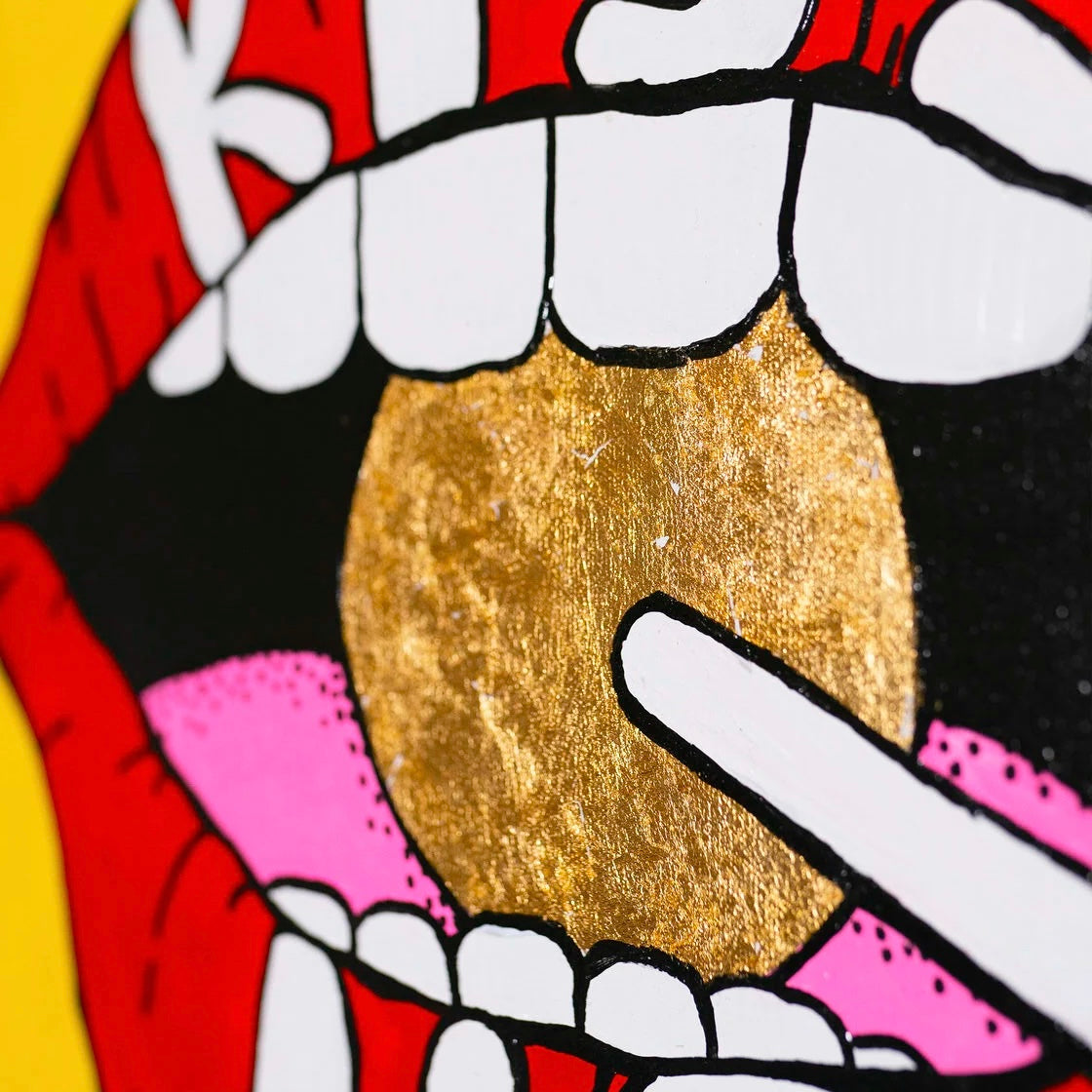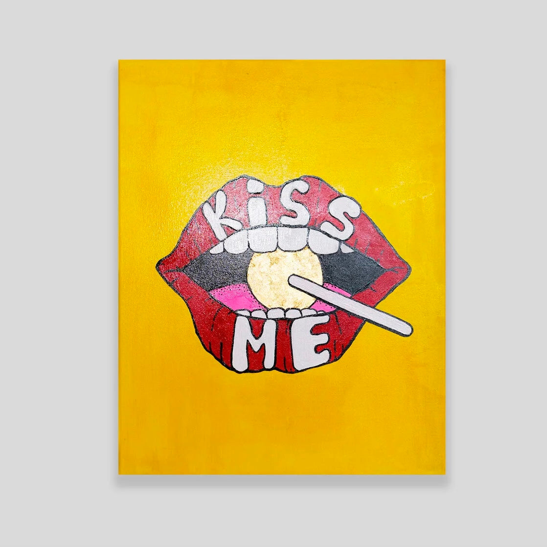 This vibrant artwork, "Bold Invitation," is a captivating piece that marries the audacity of pop art with the allure of modern-day iconography. The striking image of lips parted in a silent plea against a bold yellow backdrop is both an homage to the romantic requests of a bygone era and a cheeky nod to contemporary culture's embrace of directness and vivid expression. The use of contrasting colors and the graphic quality of the text 'KISS ME' playfully obscured by a lollipop stick speaks to a narrative of desire tempered with a sweet interruption. It's a statement piece that dares the viewer to engage with the underlying themes of communication, temptation, and the universal language of love. A perfect centerpiece for any room, this painting is a must-have for those who appreciate art with a pulse, with a message that resonates through its simplicity and boldness.