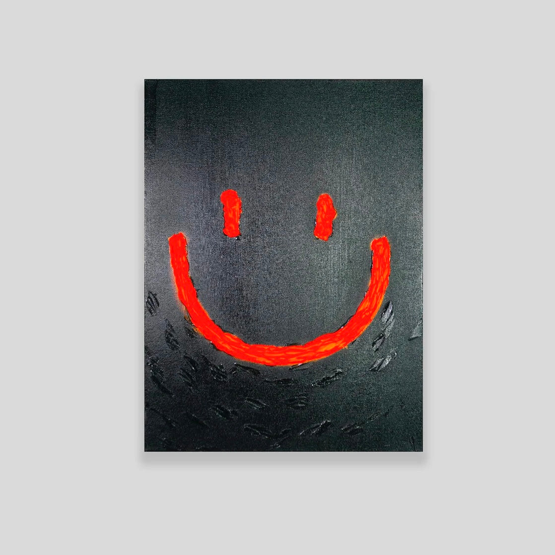 This minimalist artwork, "Gleam in the Gloom," presents a striking contrast between the vivid, fiery smile and the deep, somber background. The simplicity of the happy face exudes warmth and optimism, an ember of joy in the midst of shadow. The textured strokes of the background add depth and complexity, suggesting that even in the most monochromatic moments of life, there is a spark that can ignite happiness. The painting speaks to the resilience of the human spirit and the power of a smile to pierce through darkness. It's a modern take on a universal symbol, a reminder that happiness can be a bold act of defiance against the grey tones of the everyday.