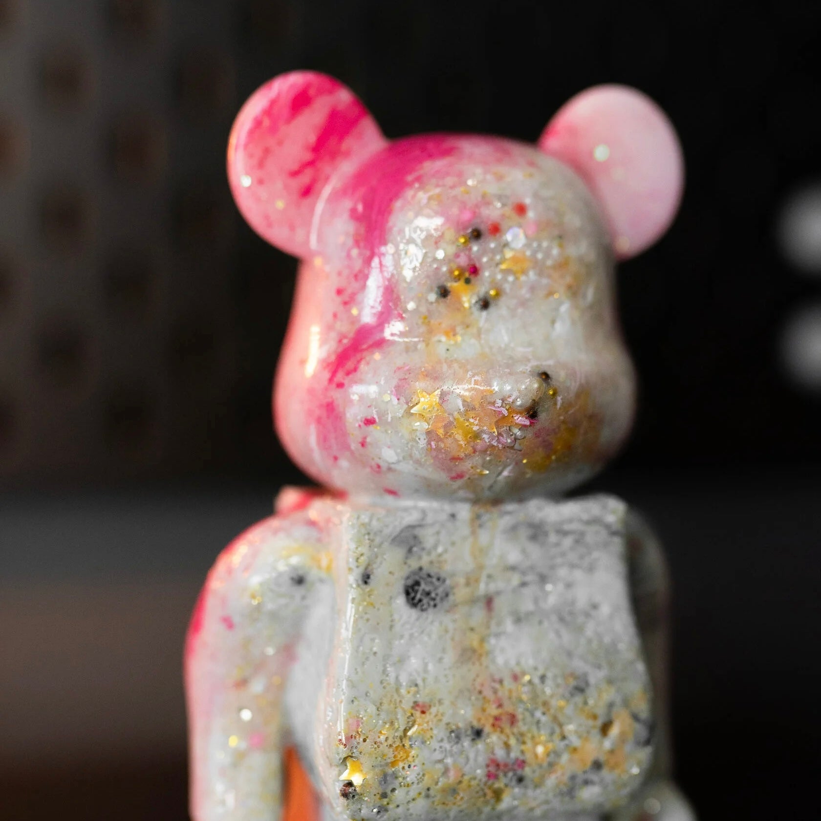 This charming figure, "Glimmer of Childhood," is a quaint representation that seems to be infused with the nostalgia of youth and the magic of imagination. The character, with its speckled texture and soft, pastel colors, exudes a certain whimsy. It's as if it were plucked from a dream or a distant memory, a companion to the innocence of childhood days. The gentle glow from the backdrop bathes the figure in a warm light, further emphasizing the sentimental value and the subtle joy it represents. This piece is perfect for those who cherish the simplicity of childlike wonder and the delight found in small, everyday wonders. It's a small totem that holds a universe of stories and a timeless reminder of the playful spirit that lives within us all.