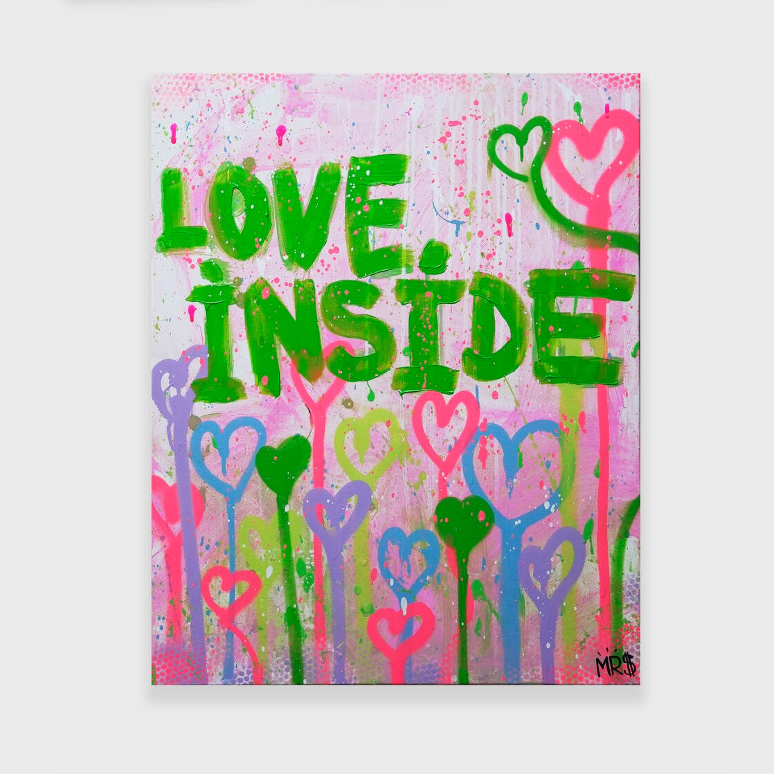 "Harmony in Heartscape" is a canvas bursting with the vibrant energy of love. Bold, green letters spell out "LOVE INSIDE," setting the theme for a backdrop where whimsical hearts flourish like flowers in a wild, colorful garden. Splashes of pink, blue, and neon speckle the painting, like confetti in a celebration of affection. This joyful artwork is a visual serenade to the sentiment that blooms within, a reminder that love is not just something we feel but something we grow and nurture. It's a perfect piece to brighten any room, to inspire joy, and to serve as a daily affirmation of the love that surrounds and fills us.