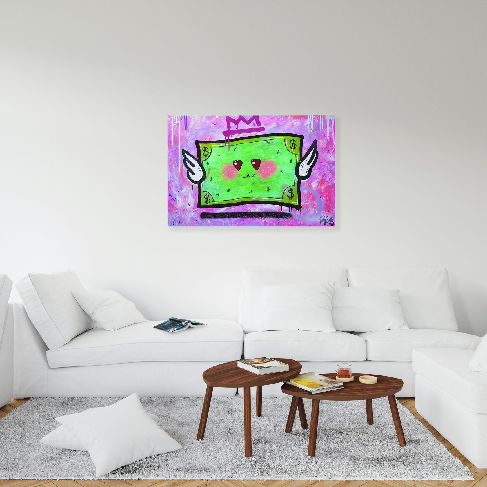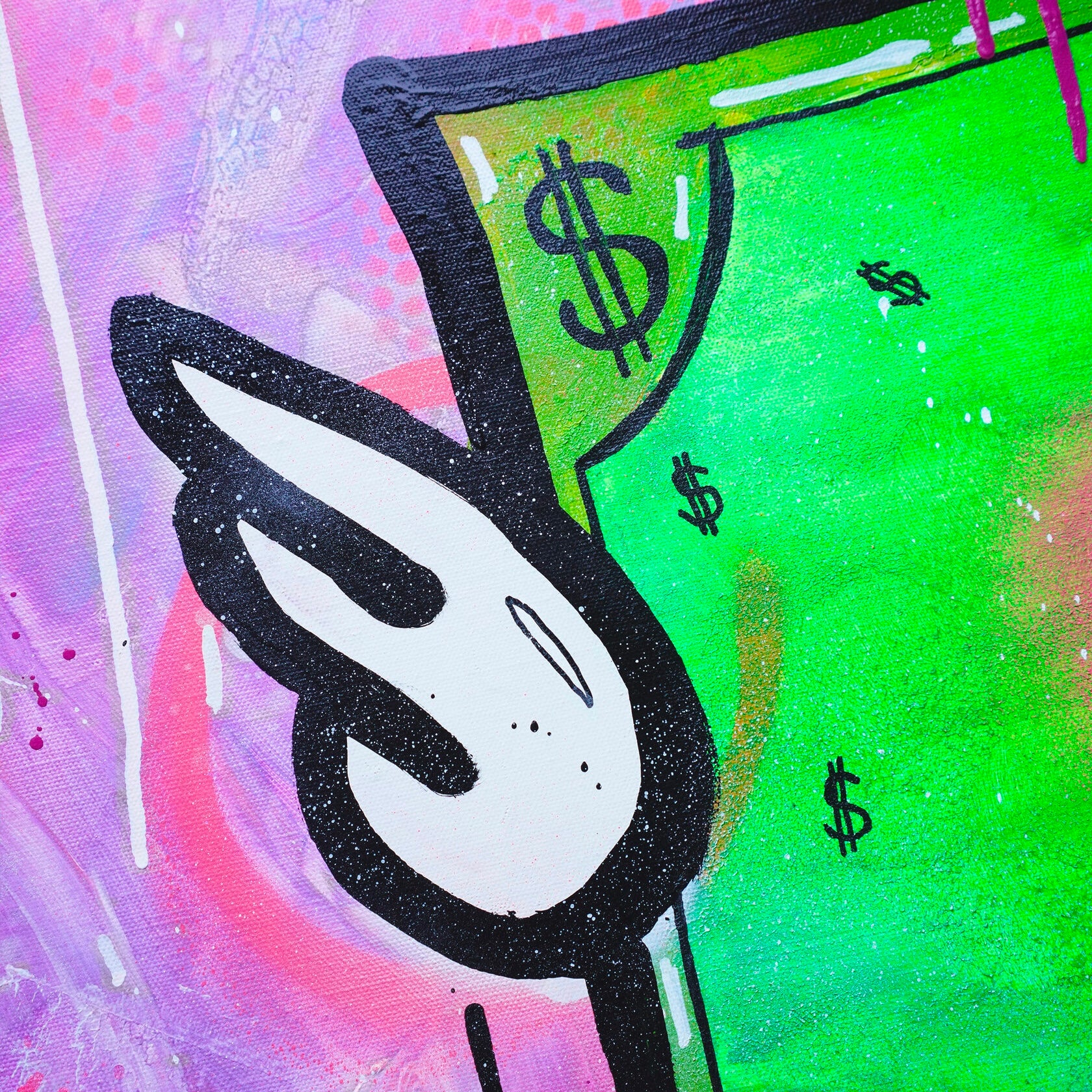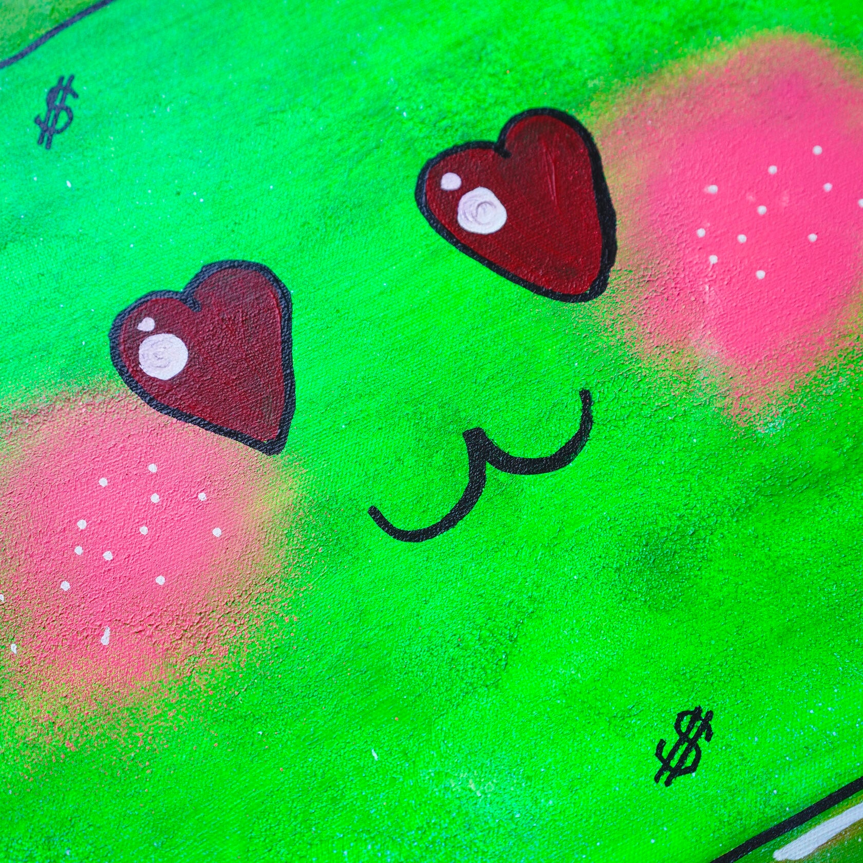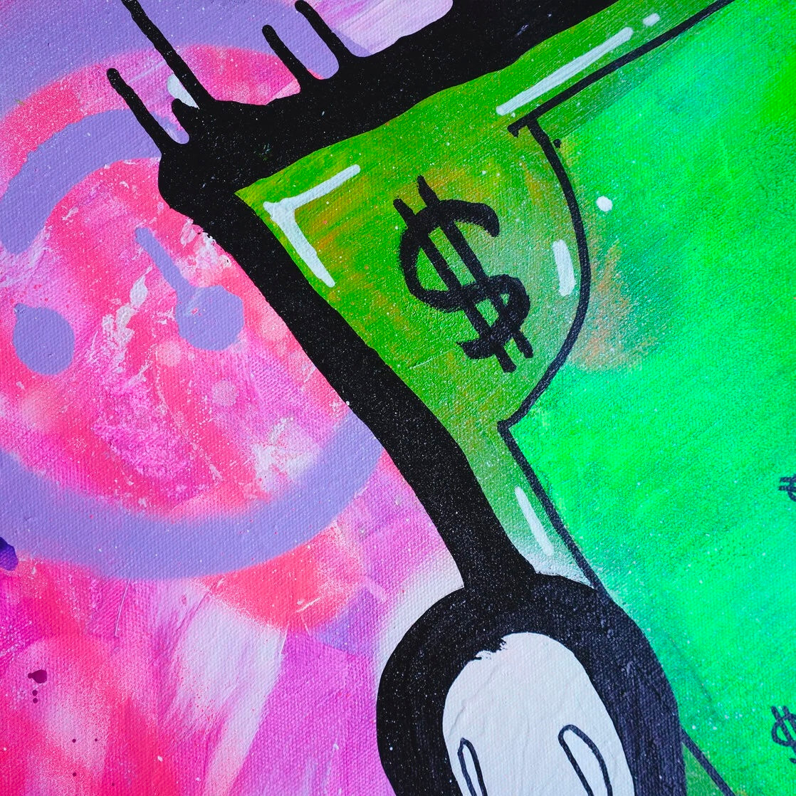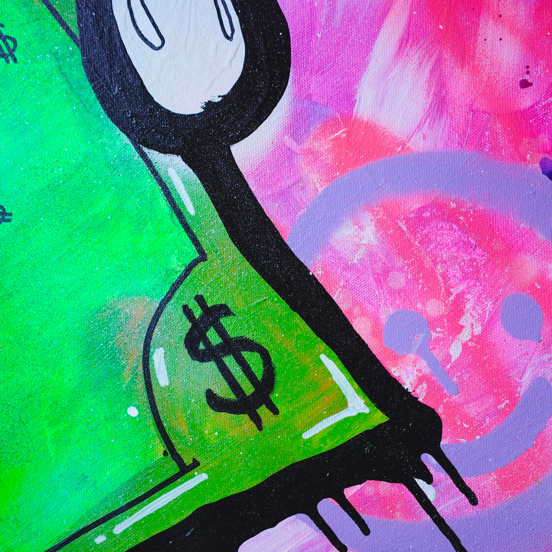 A cheerful dollar that floats in the air. On his face you can see joy and happiness, he brings good luck since everything around him is very bright and alive. This dollar is a girl, all the banknotes depict only men, so this bill has its own mood, it is shy and very cute. I drew this picture when DJ was performing at the club. Everyone who saw her smiled and took pictures, she attracts the eyes of many people