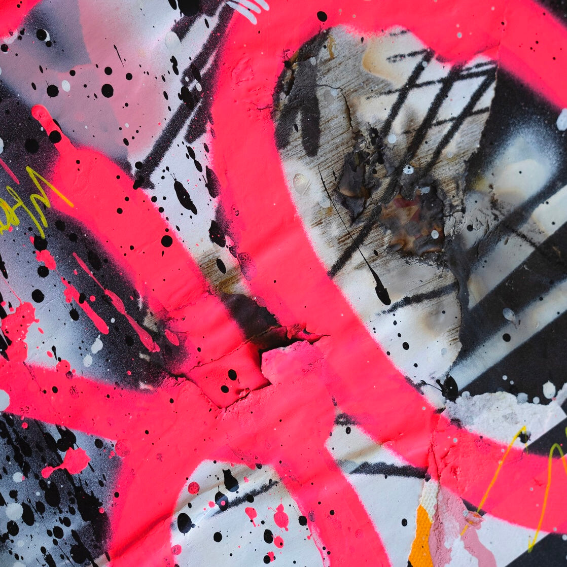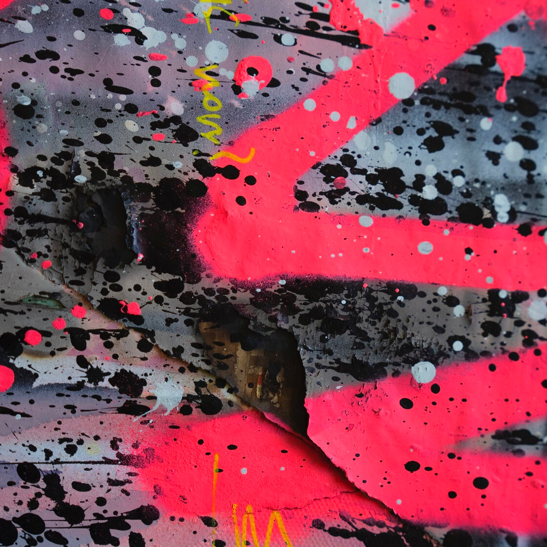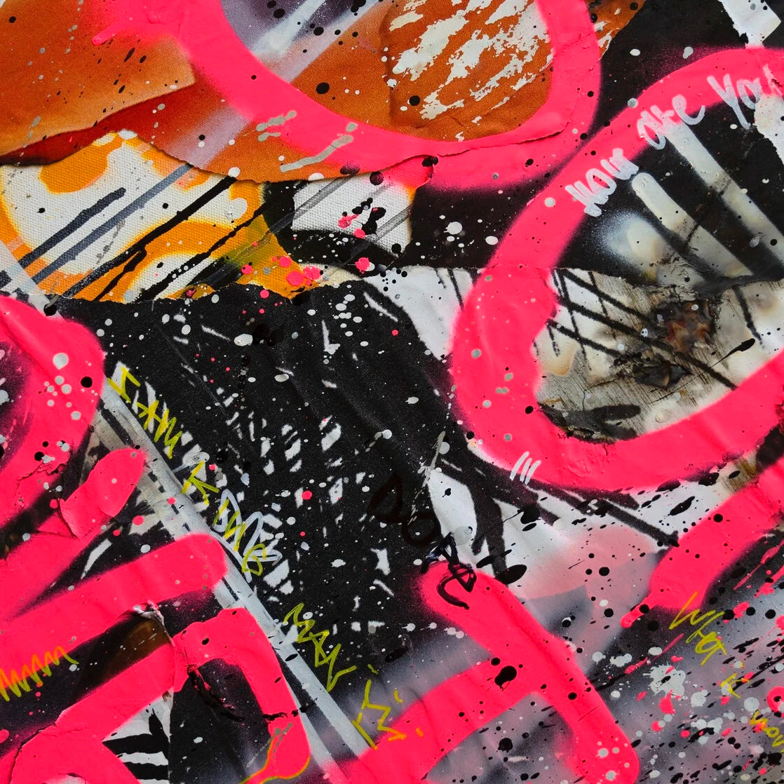 "Neon Manifesto" is a rousing visual shout, a pop art-infused proclamation that throbs with the beat of the city's heart. Bold, neon pink letters declaring "BORN TO LOVE" dominate the canvas, a powerful statement scrawled with an energy that's as infectious as a chart-topping hook. The splatters and drips of paint, the stenciled words and shapes in the background, all contribute to a sense of chaotic beauty, of raw emotion splashed and layered in the moments of creative fervor. This piece is an anthem of positivity, a graffiti-esque ode to the enduring human spirit, and to our intrinsic need for connection. It's a visual representation of love's loud declaration, perfect for those spaces that embrace bold statements and vibrant, unapologetic living