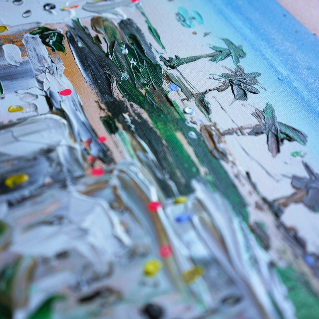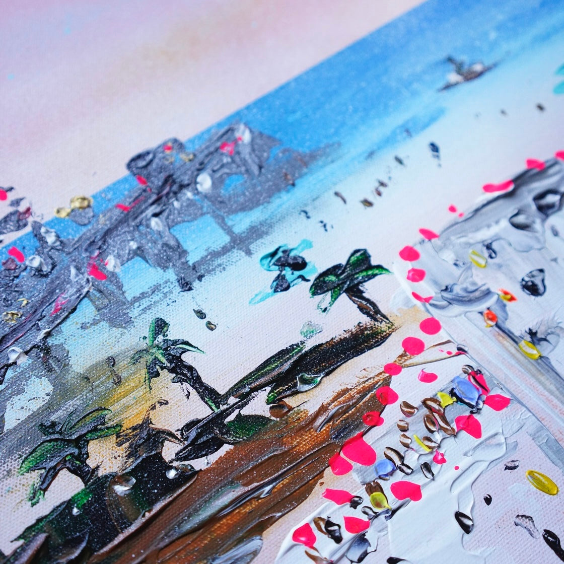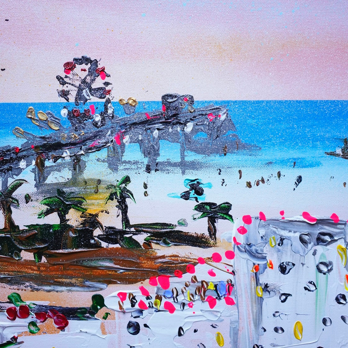 party lights of the pier and the night city, the night is already close, but the outlines of the city are still visible, people on the beach, streets, lights have already turned on in the houses, and on the roof there is a fun party and there is a lot of music and smiles, a picture with a good mood so how I was on this roof and drawing at the moment when DJ was playing music in live format. It was painted without a brush, just a mastekin.