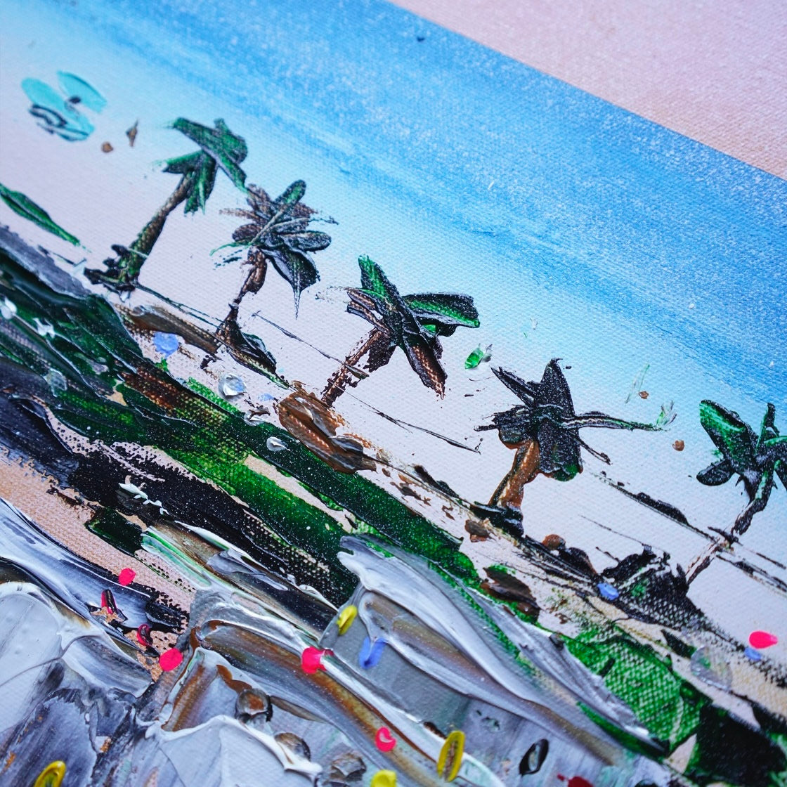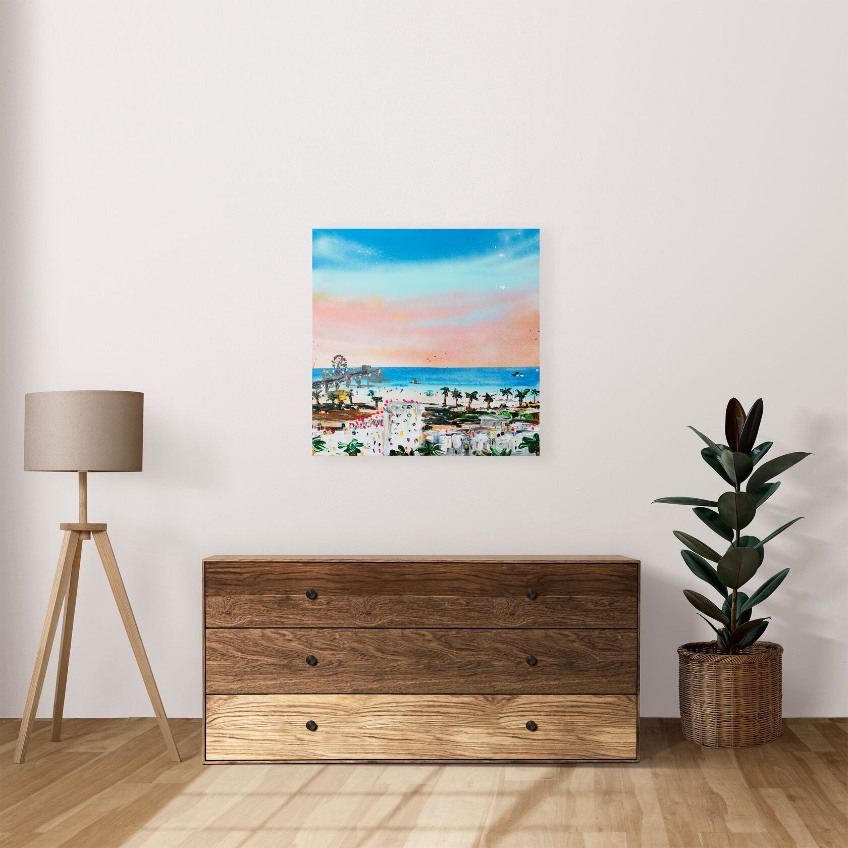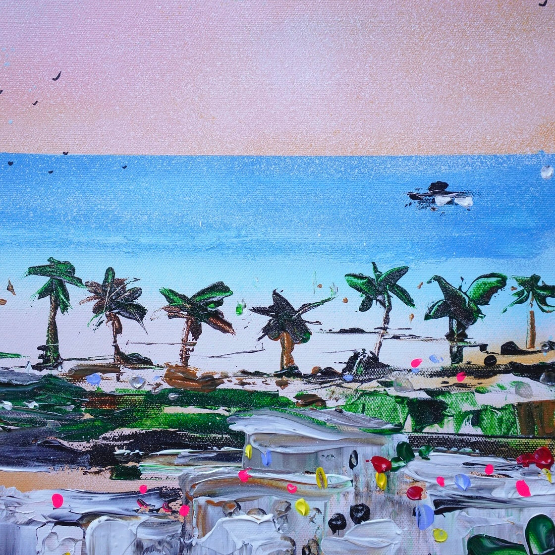 party lights of the pier and the night city, the night is already close, but the outlines of the city are still visible, people on the beach, streets, lights have already turned on in the houses, and on the roof there is a fun party and there is a lot of music and smiles, a picture with a good mood so how I was on this roof and drawing at the moment when DJ was playing music in live format. It was painted without a brush, just a mastekin.