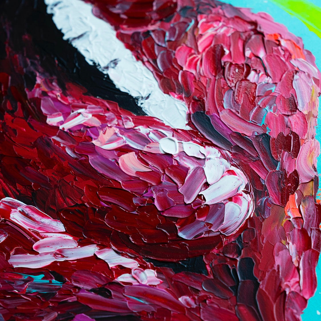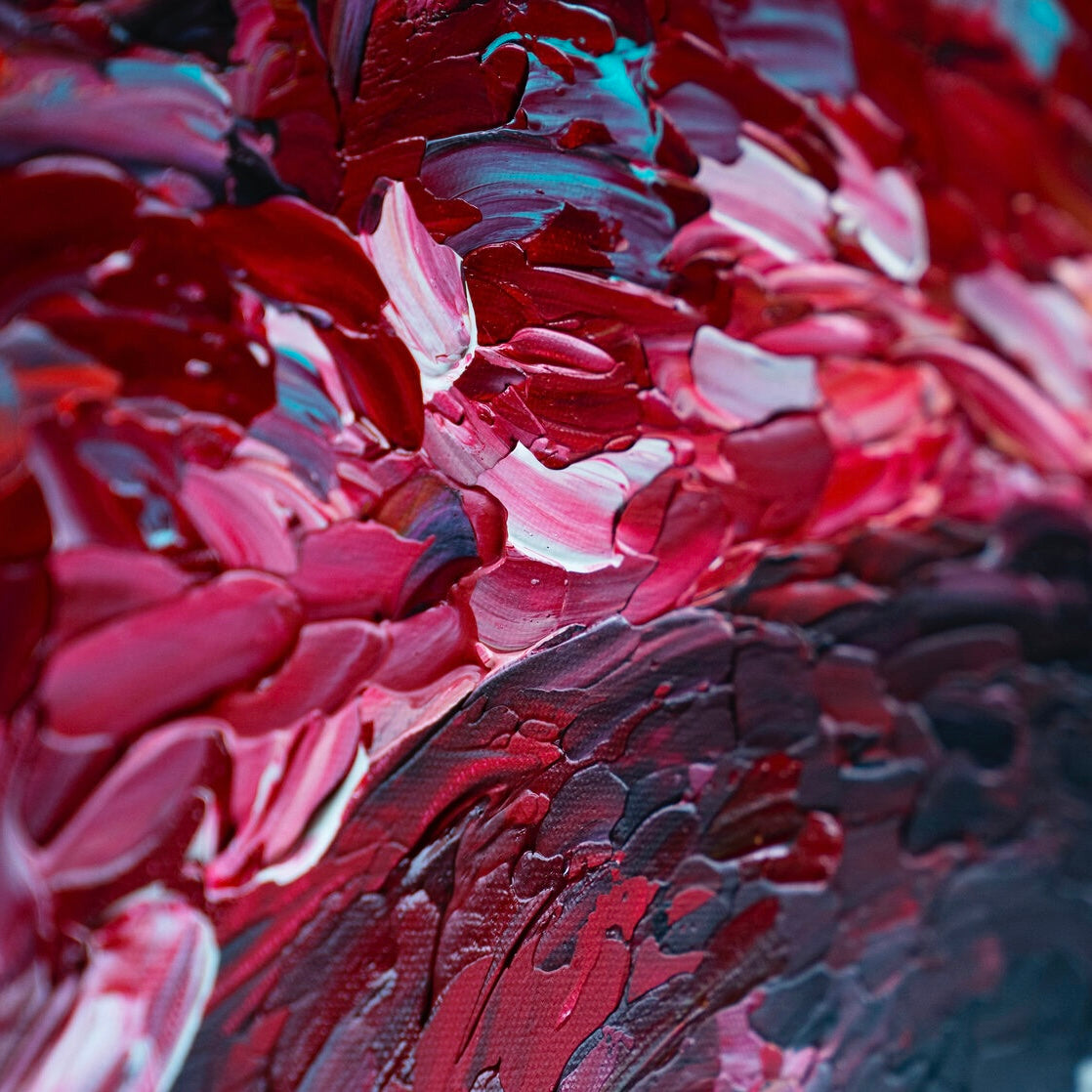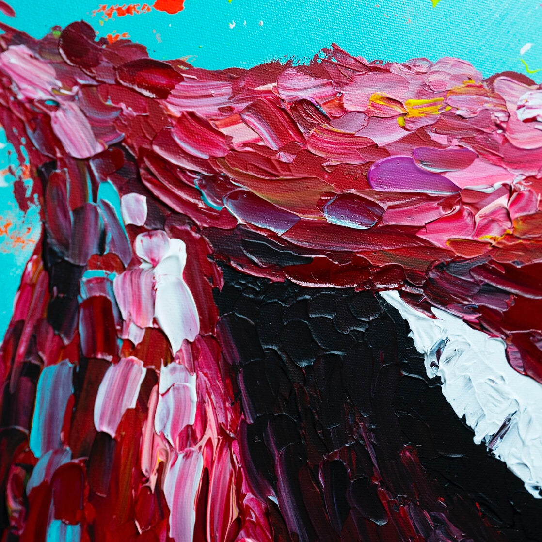 «Spectrum Kiss» — is a bold and dynamic celebration of color and sensuality. The lips, painted in rich shades of red and burgundy, are textured in a way that gives them a tantalizingly tactile appearance. This contrasts with the electrifying bursts of neon green, bright orange, and bright pink that seem to dance in the background, reflecting the excitement of a passionate kiss. A work of art is a vibrant visual symphony that plays with themes of desire, energy, and vibrant life. This work of art is not just hanging on the wall.; it jumps off her, engaging the senses and inviting the viewer to embrace the full range of emotions it conveys.