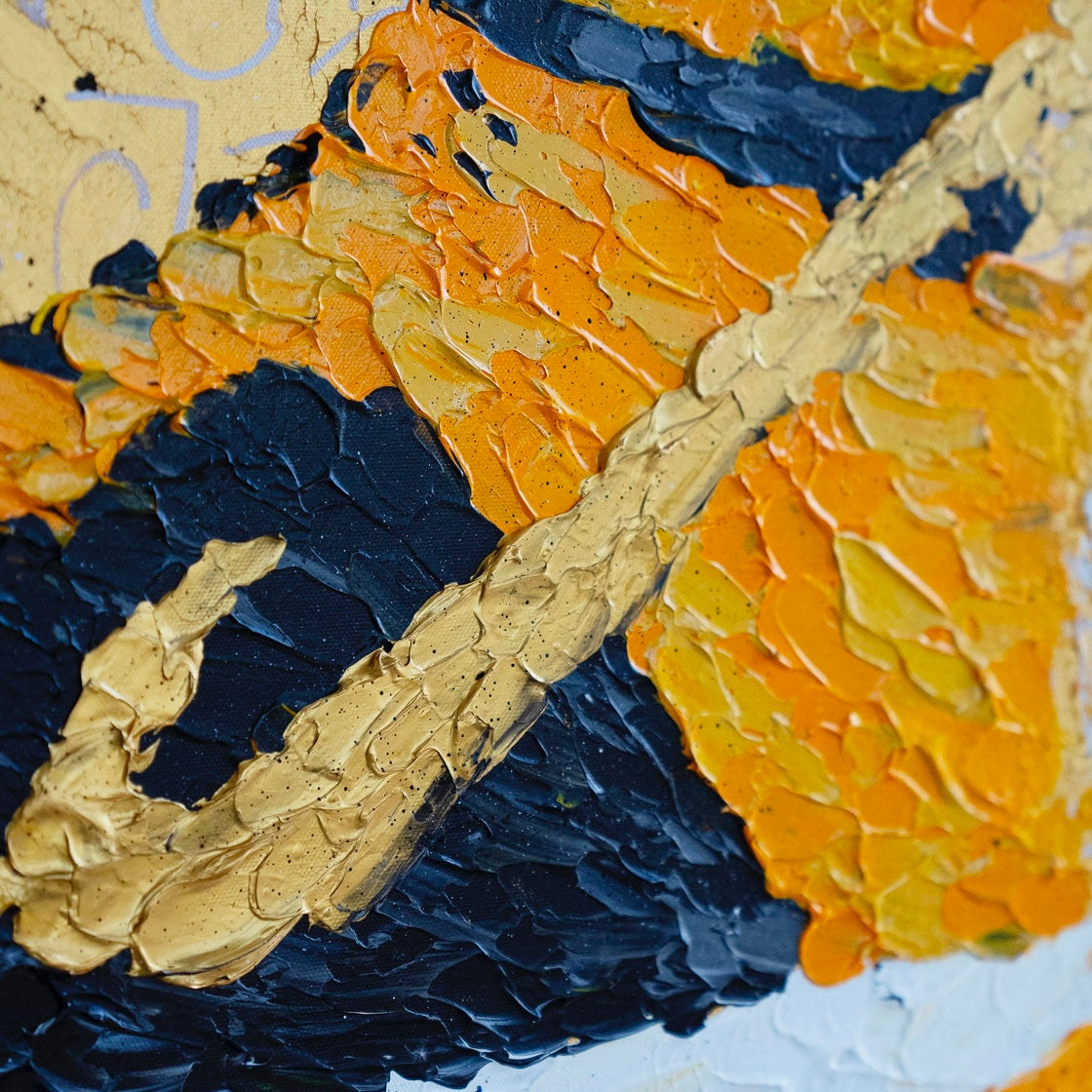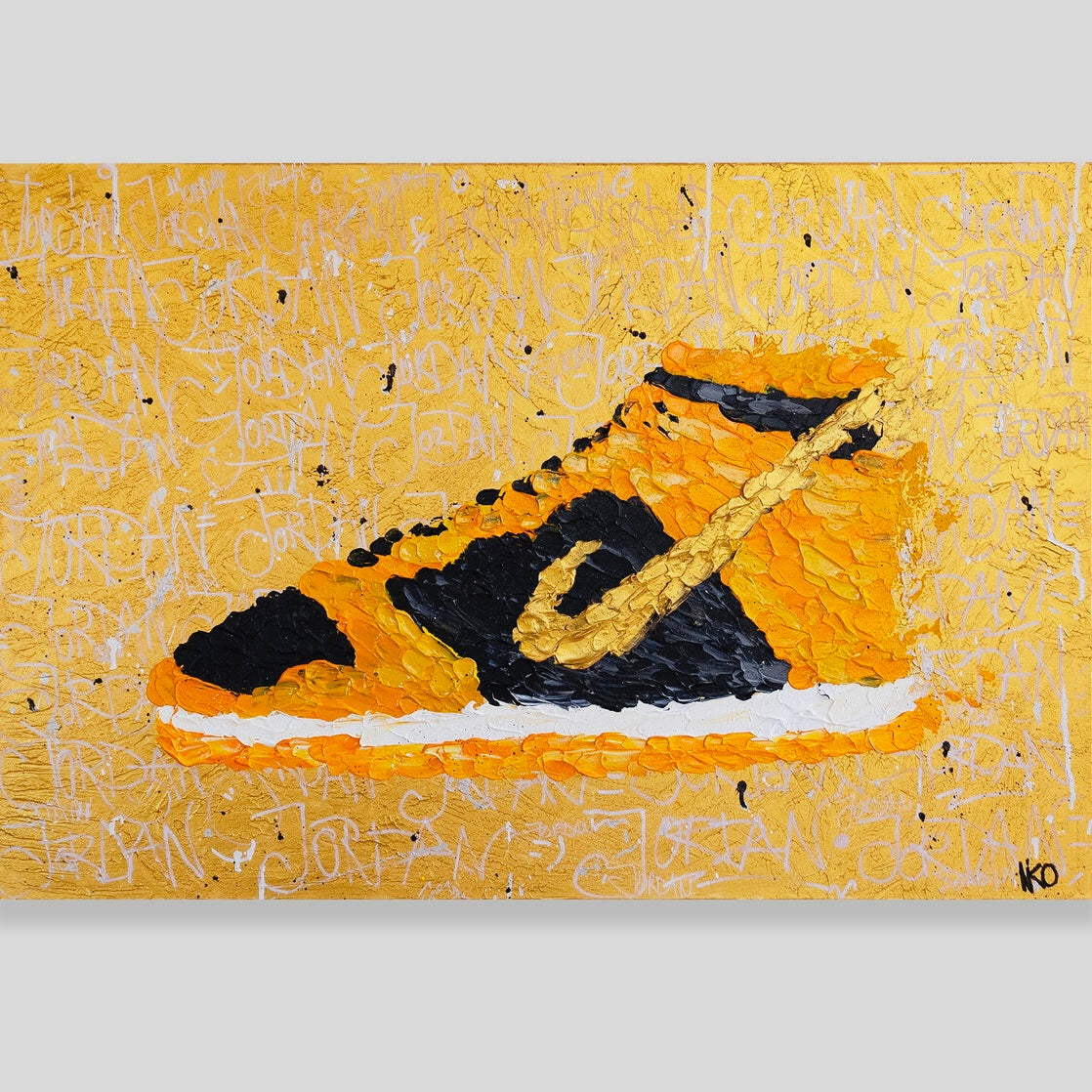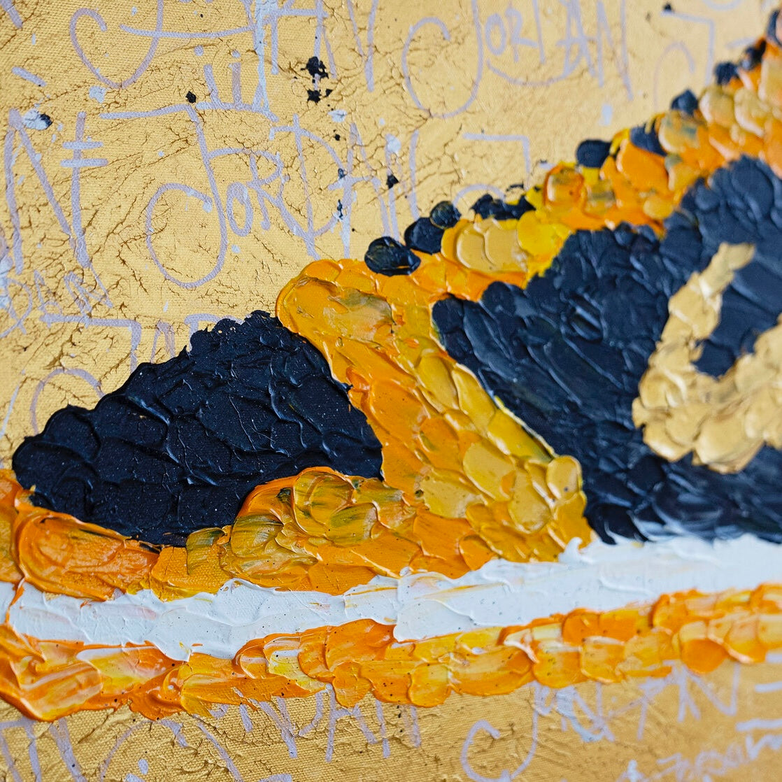 "Stride of Pride" is an energetic and textured visual symphony that celebrates the iconic and the everyday. The central focus, a boldly stylized sneaker, leaps off a canvas bustling with golden inscriptions, symbolic of the graffiti-adorned urban landscapes. The textured layers of paint not only build the image but also convey a sense of movement and vitality, akin to the bustling streets where such footwear treads daily. This piece embodies the spirit of youthful ambition and the vibrant journey through life's challenges and triumphs. It speaks to the cultural significance of the sneaker as more than just attire, but as a statement of identity and pride. The background's chaotic script serves as a testament to the numerous paths walked and the stories etched into each step of the way.