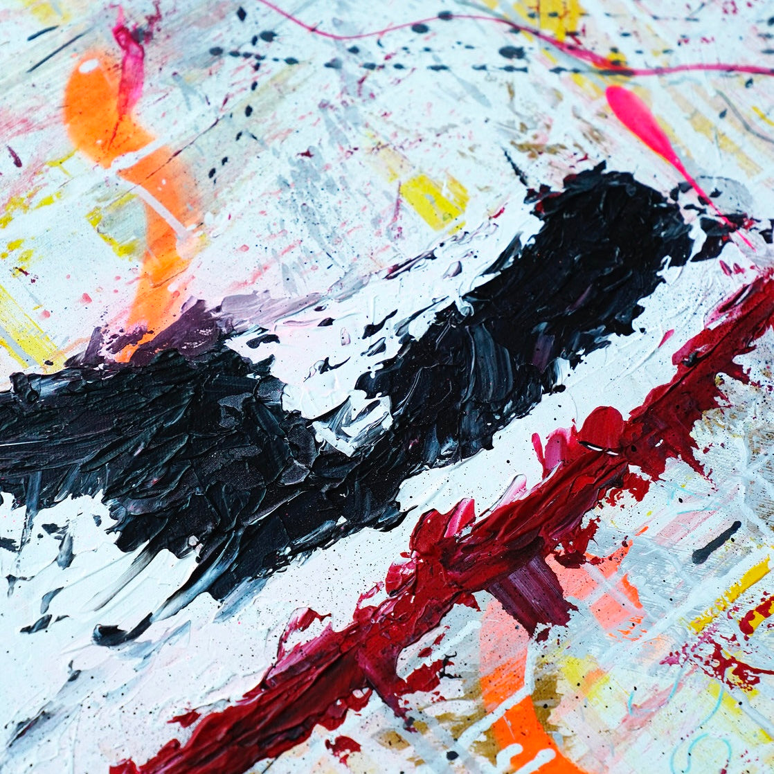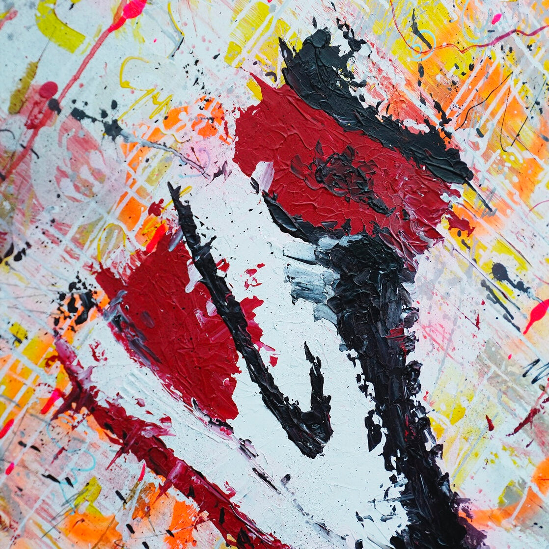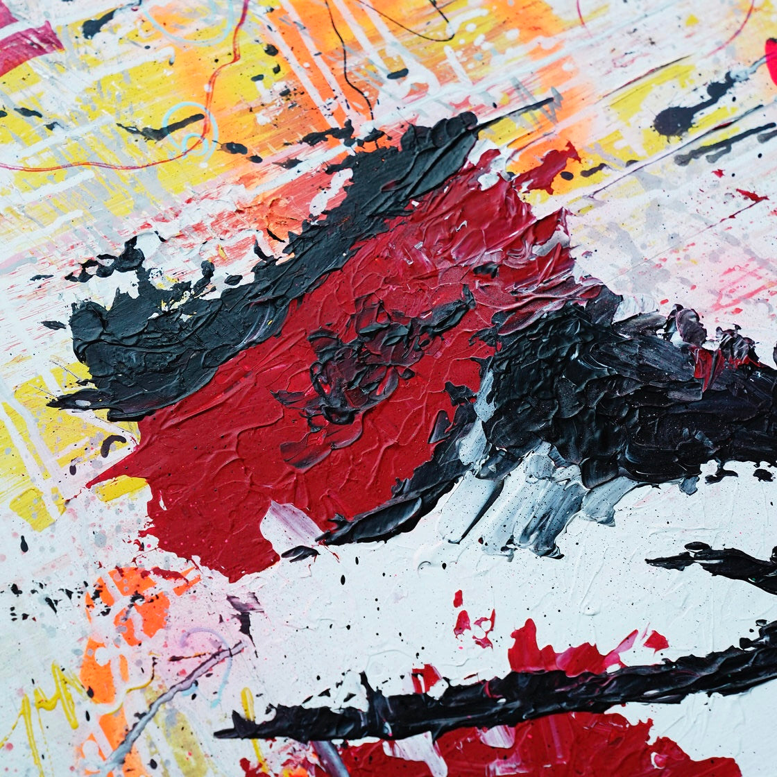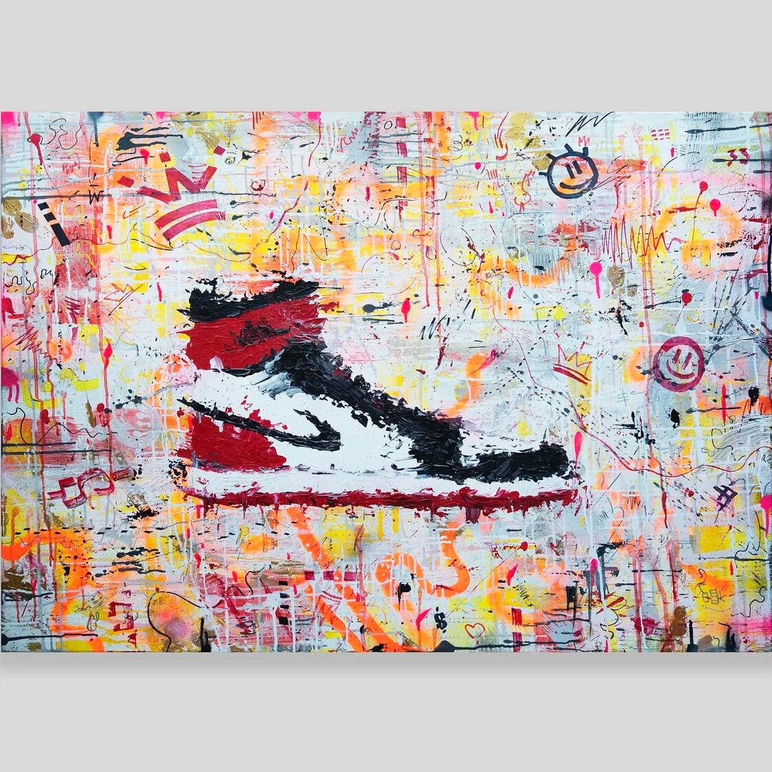 "Urban Grunge Symphony" is a visual cacophony of street aesthetics and pop culture iconography. The sneaker, an emblem of urban fashion, stands out against a discordant canvas of yellow, white, and red splashes, reminiscent of the frenetic energy of city life. The background is a wild mix of graffiti tags, drips, and expressive marks, suggesting the constant motion and creative expression that pulse through the veins of the metropolis. This artwork captures the spirit of youth, rebellion, and the relentless beat of the urban jungle. It's a raw, unfiltered tribute to the streets that birth trends and define generations.