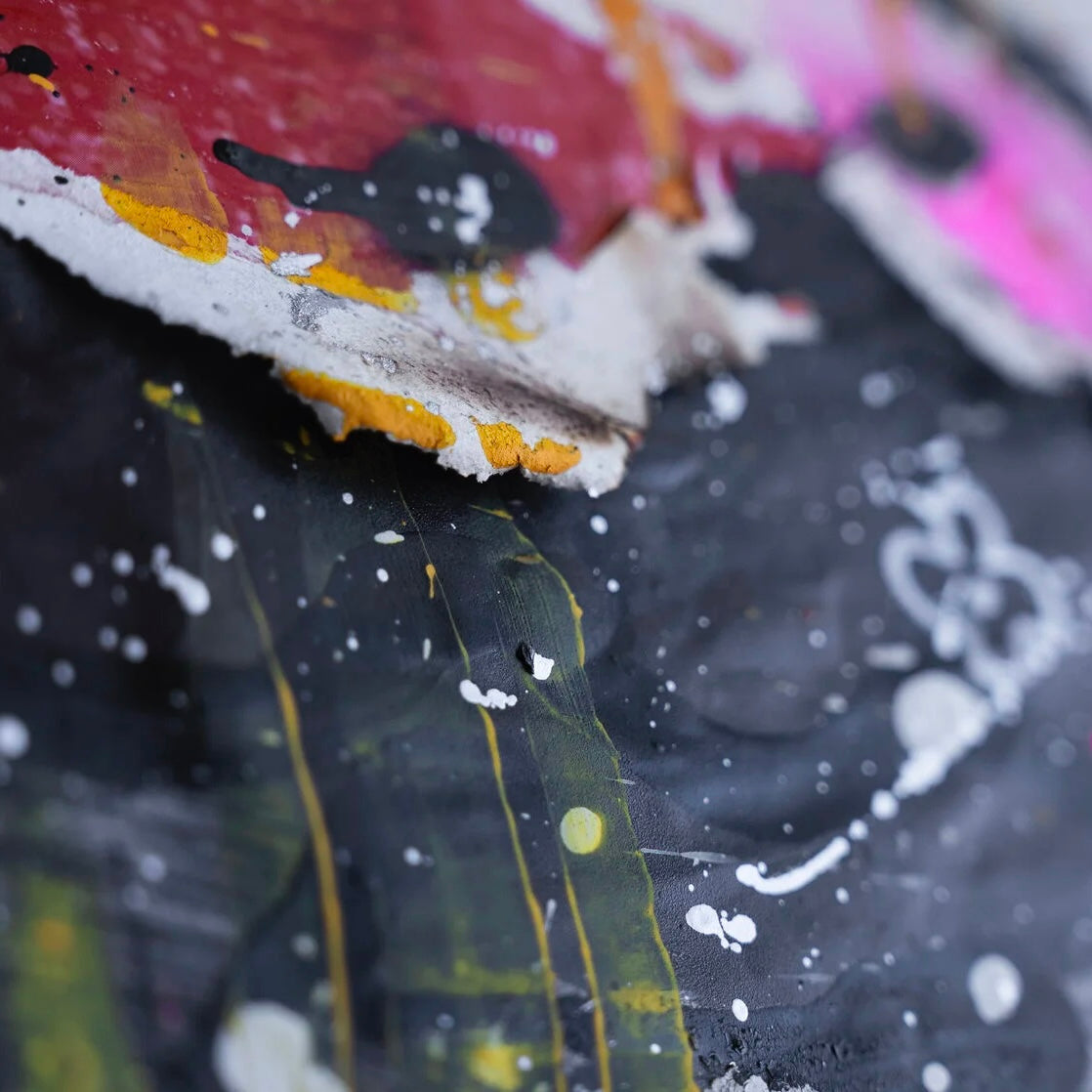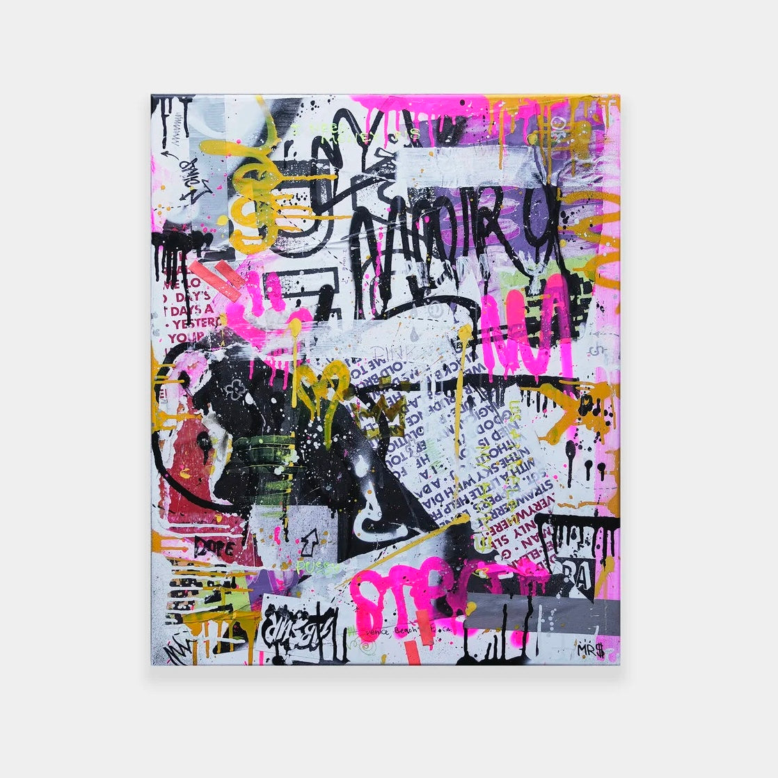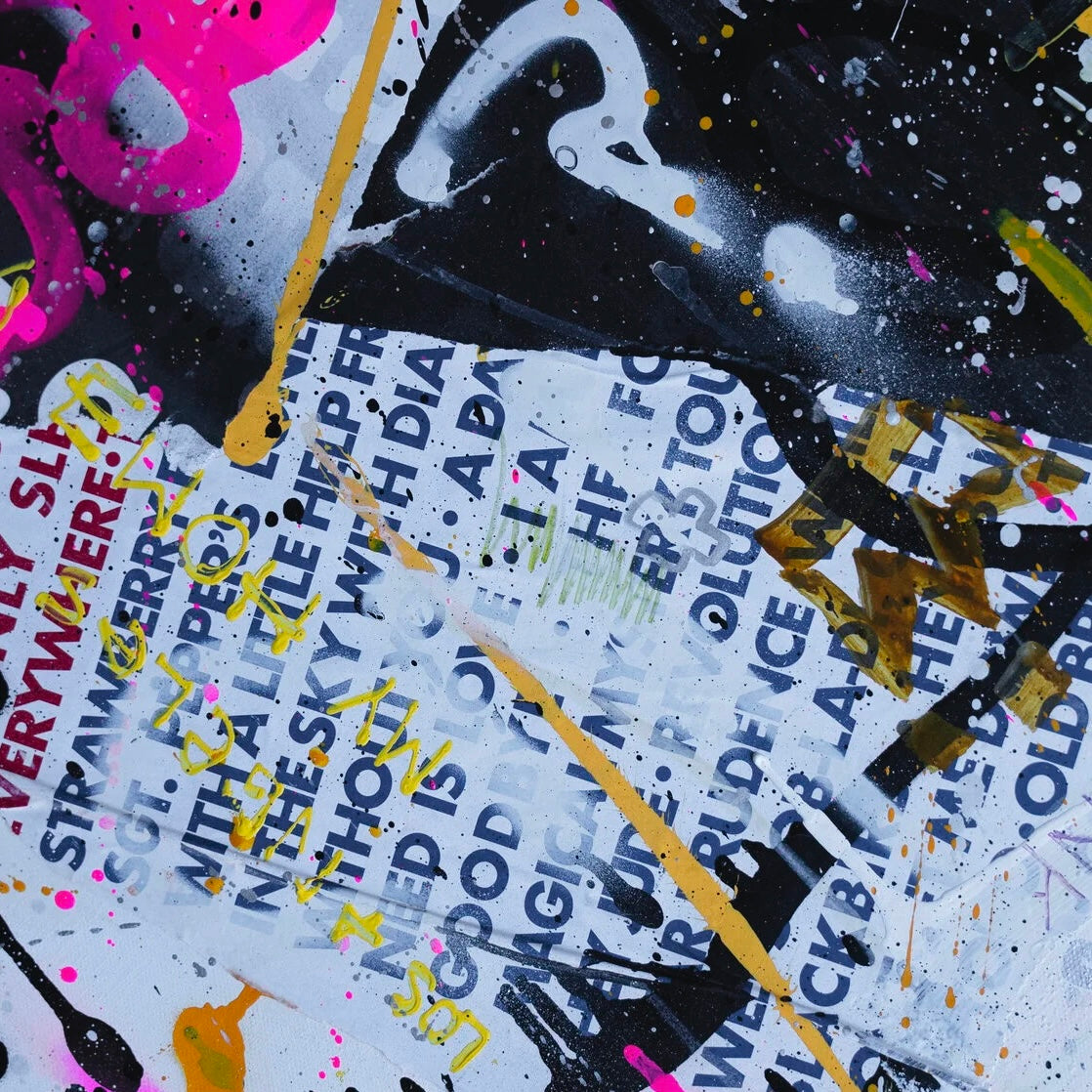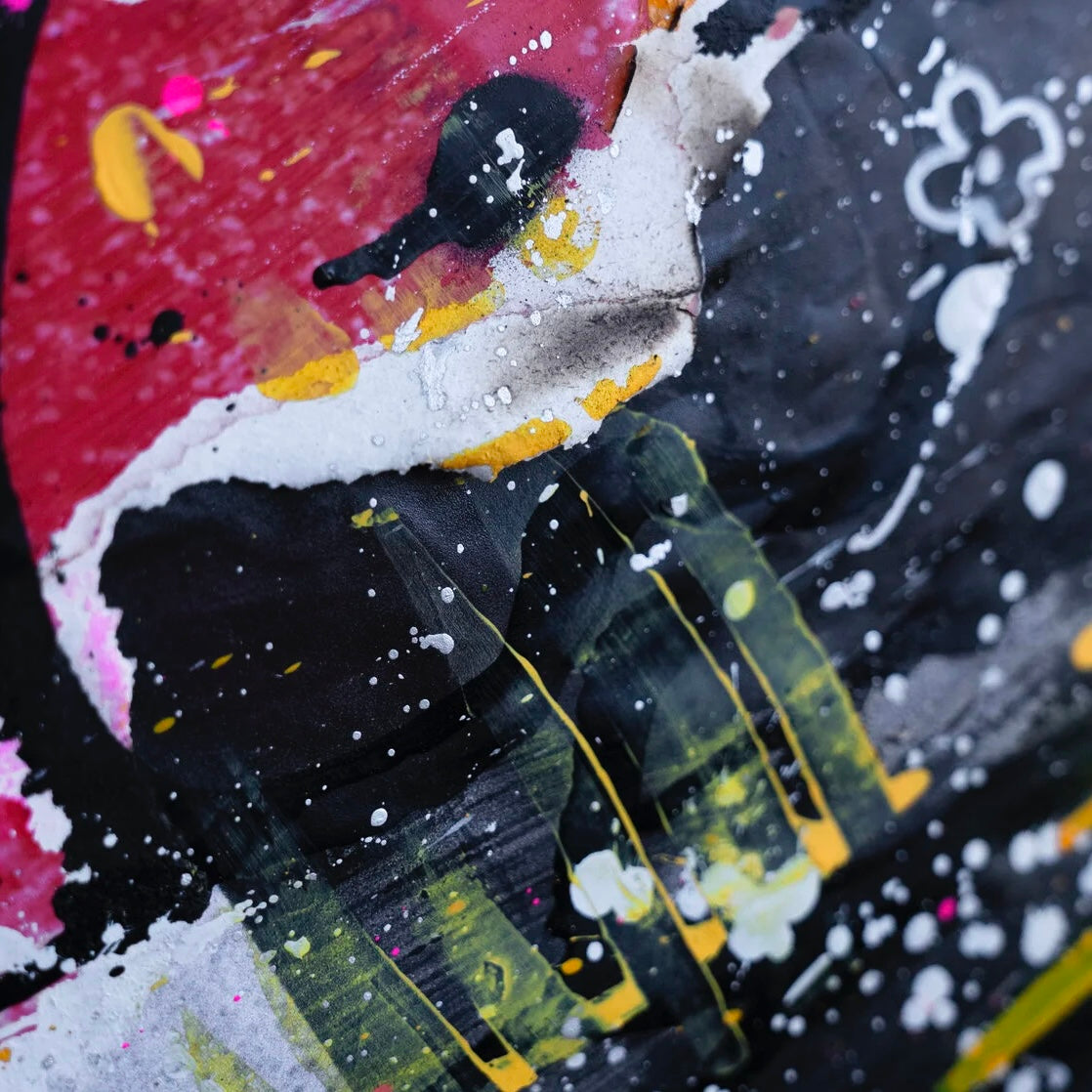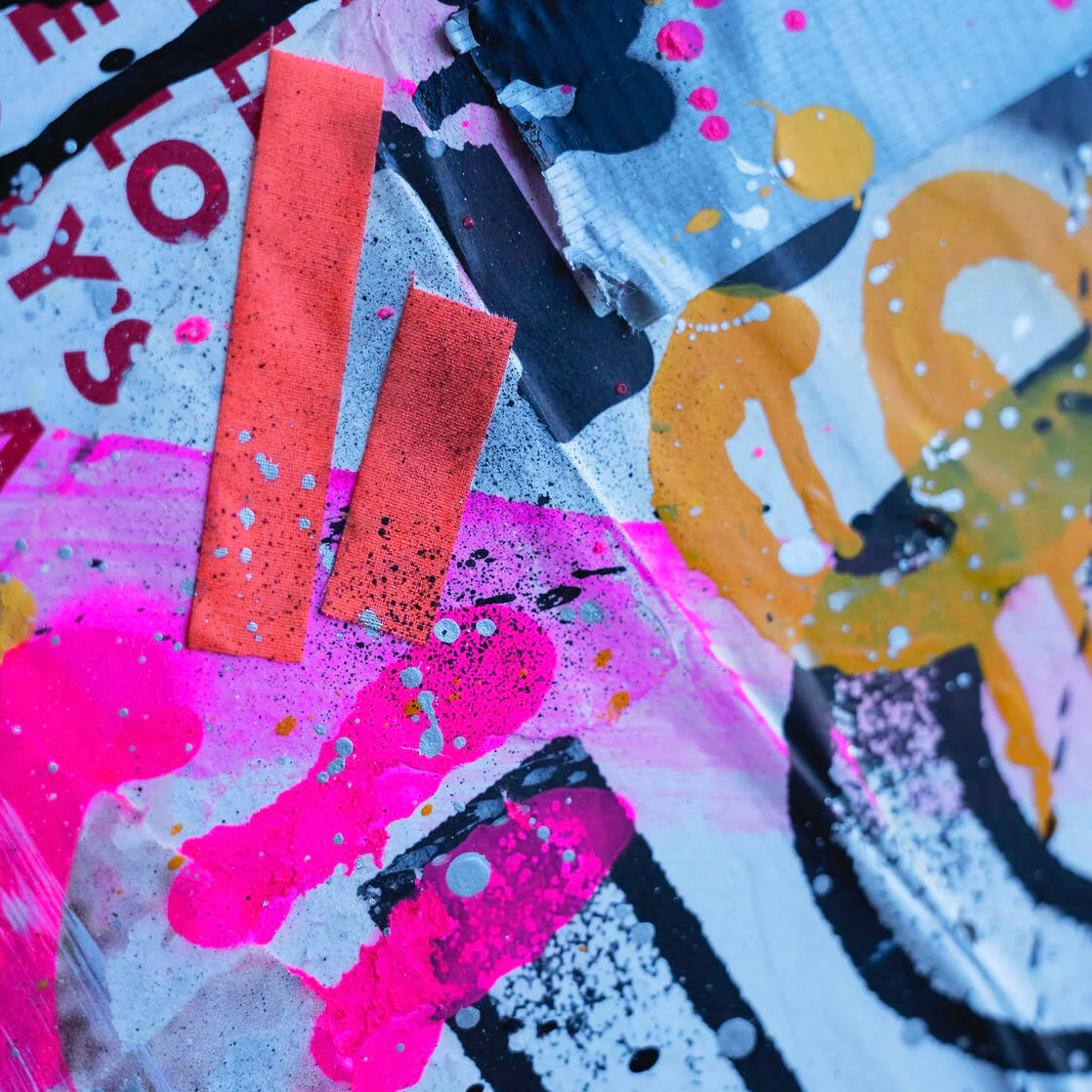 "Urban Palimpsest" is an evocative work of art that captures the layered soul of city streets. It's a visual cacophony that mirrors the graffiti-laden walls of an urban landscape, where every mark and scrawl tells a story. The clash of colors—neon pinks and yellows against the sobering blacks and whites—illustrates the energy and noise of city life. Text in various fonts and scribbles suggests the overlapping conversations and lives that occur in shared spaces. This painting is a testament to the ever-changing, ever-moving nature of the metropolis—the drips and splatters symbolizing the constant state of flux. It's a piece for those who find beauty in the chaos, for those who see the rhythm in the city's cacophony. It will bring an authentic breath of street art into any space it inhabits.